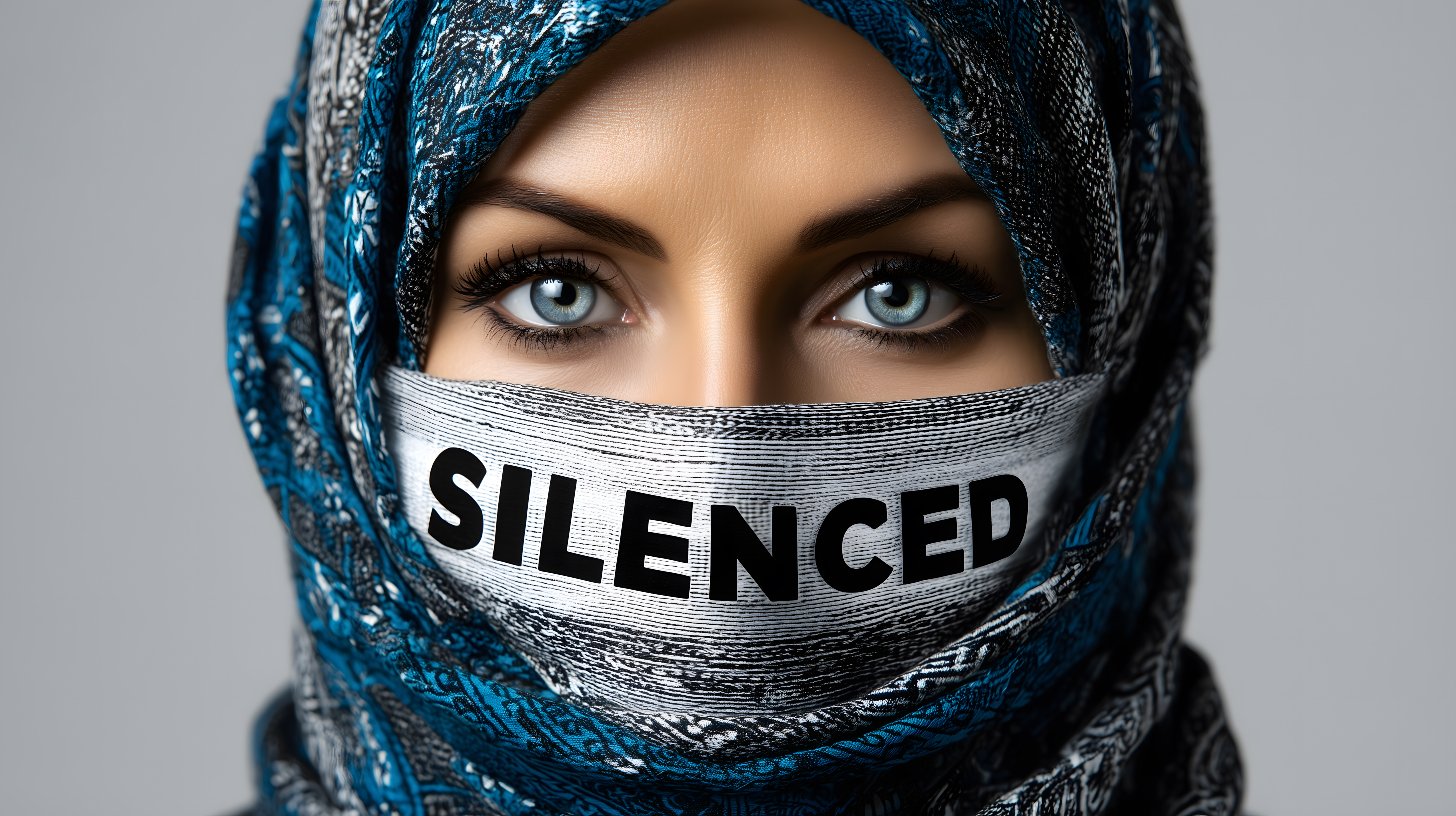 Frau mit Hijab und Mundschutz mit dem Wort Silenced als Protestsymbol