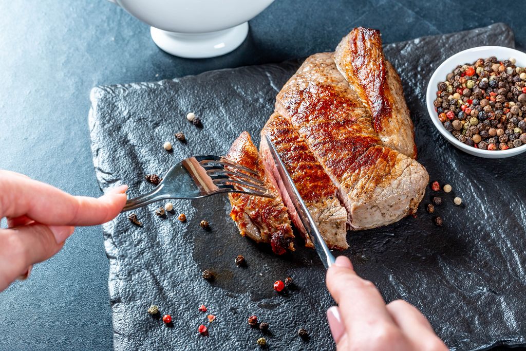 Frau schneidet frisches Steak auf Schieferplatte, daneben verschieden farbige Pfefferkörner