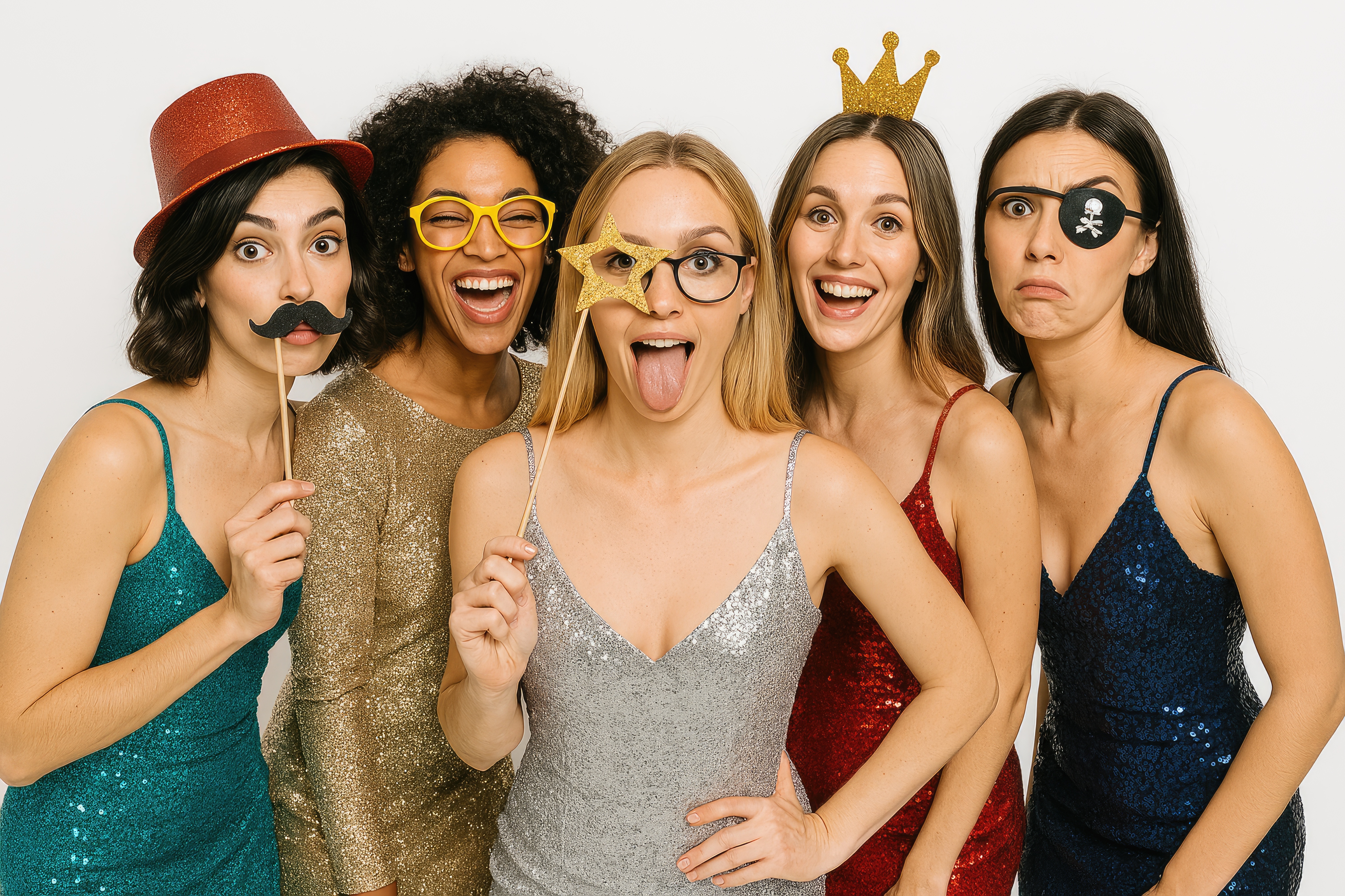 Frauen mit Party-Accessoires und Glitzerkleidern