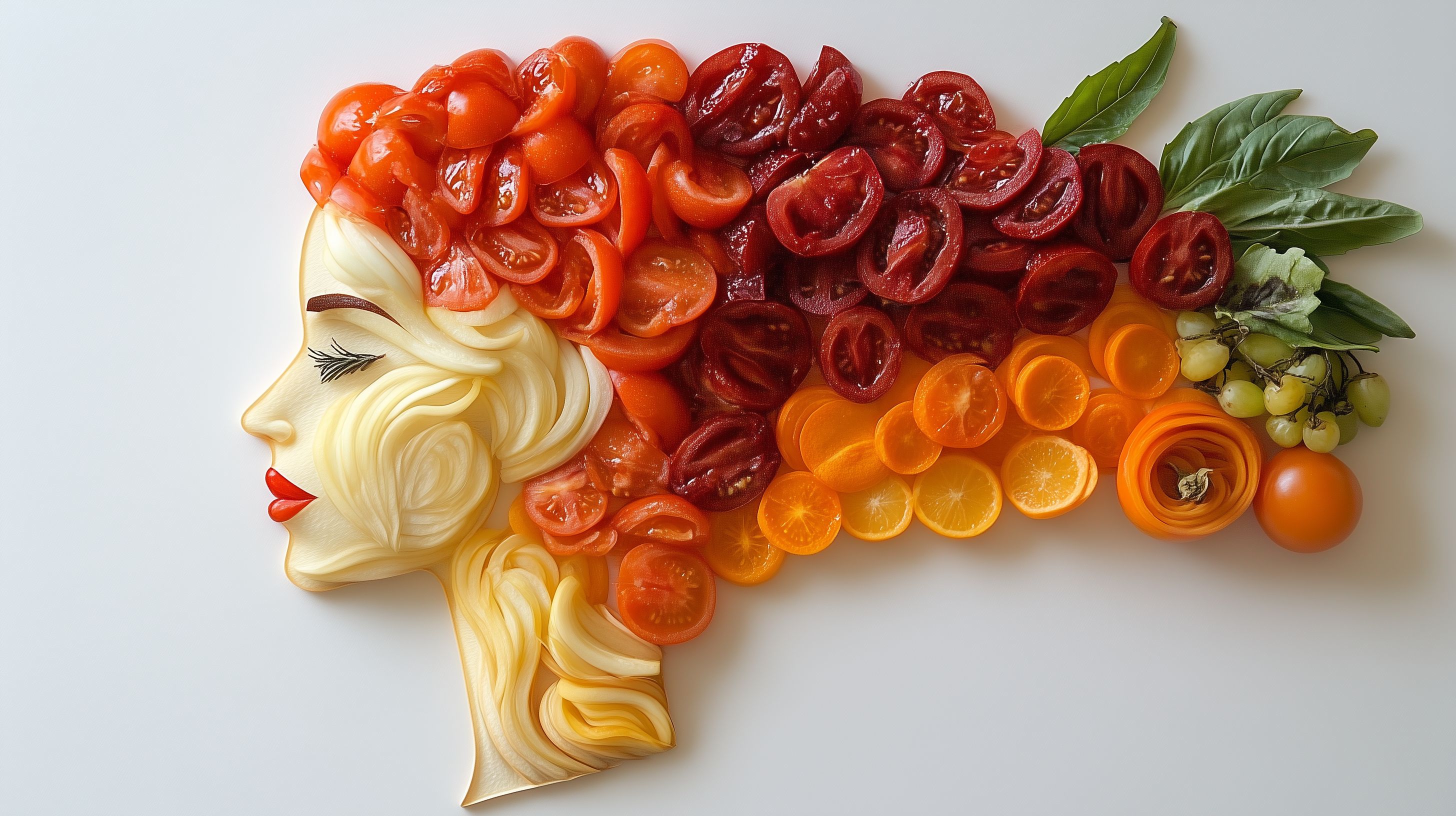 Frauengesicht aus Tomaten, Trauben und Zitrusfrüchten, kunstvoll arrangiert