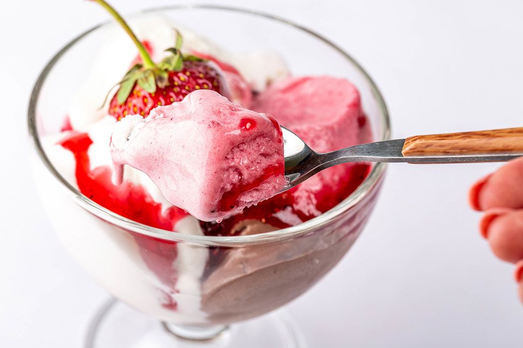 Frauenhand löffelt Erdbeereis mit Sauce aus dem Eisbecher