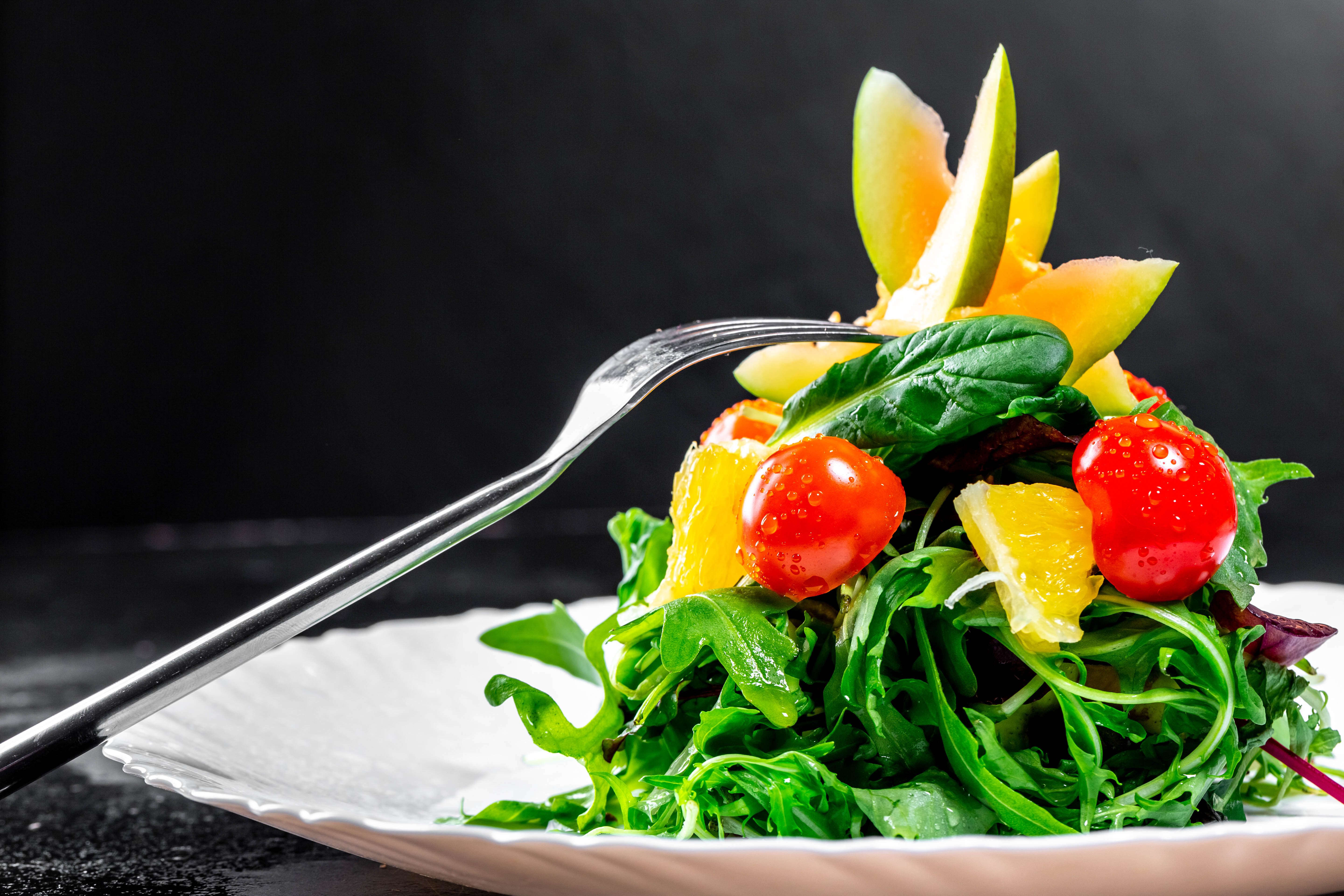 Fresh salad with herbs, tomatoes, avocado and orange on a plate with a fork