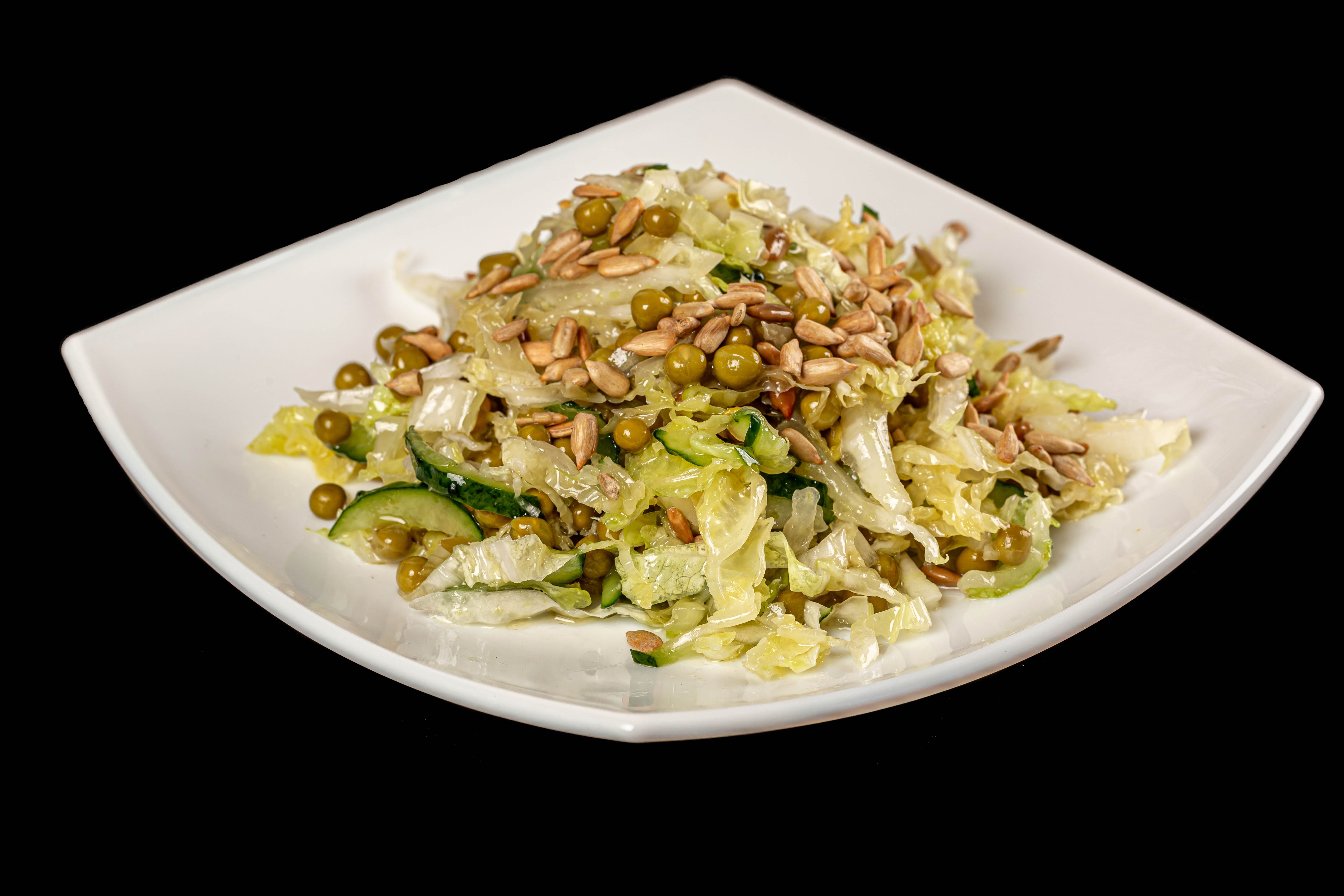 Fresh salad with sunflower seeds, chinese cabbage, peas and cucumbers