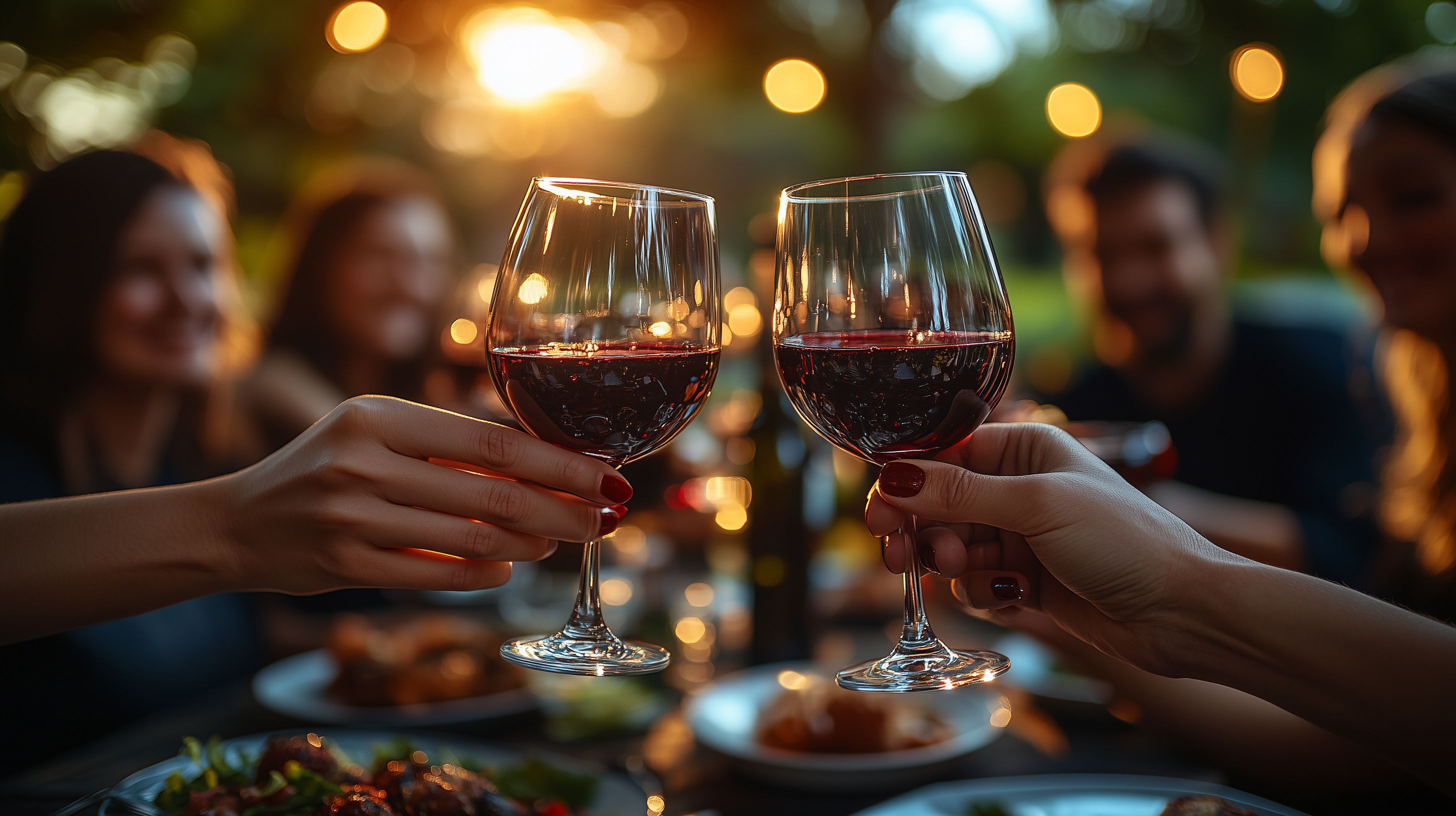 Freunde stoßen mit Rotwein im Abendlicht an