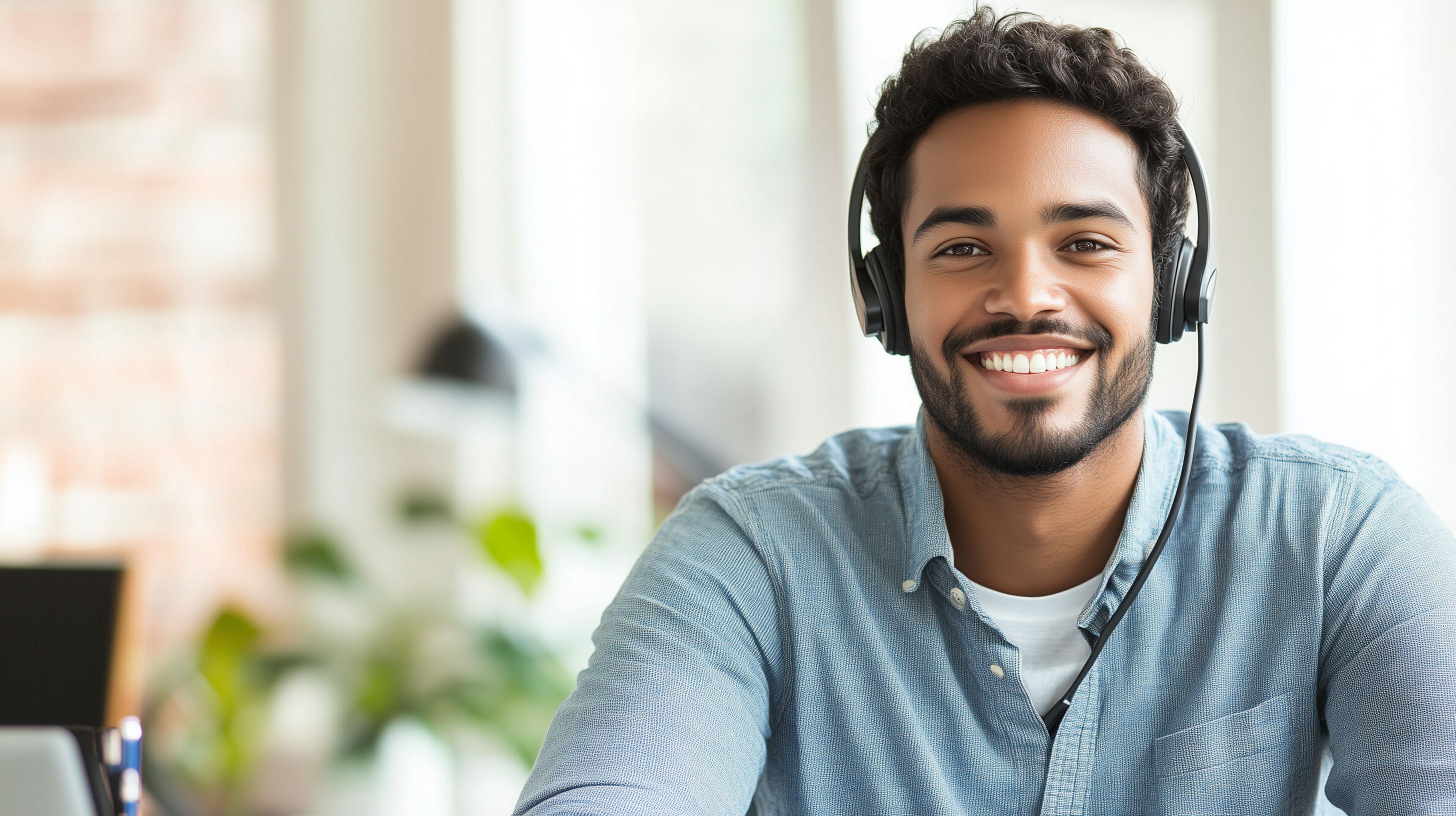 Freundlicher männlicher Callcenter-Agent mit Headset am Schreibtisch