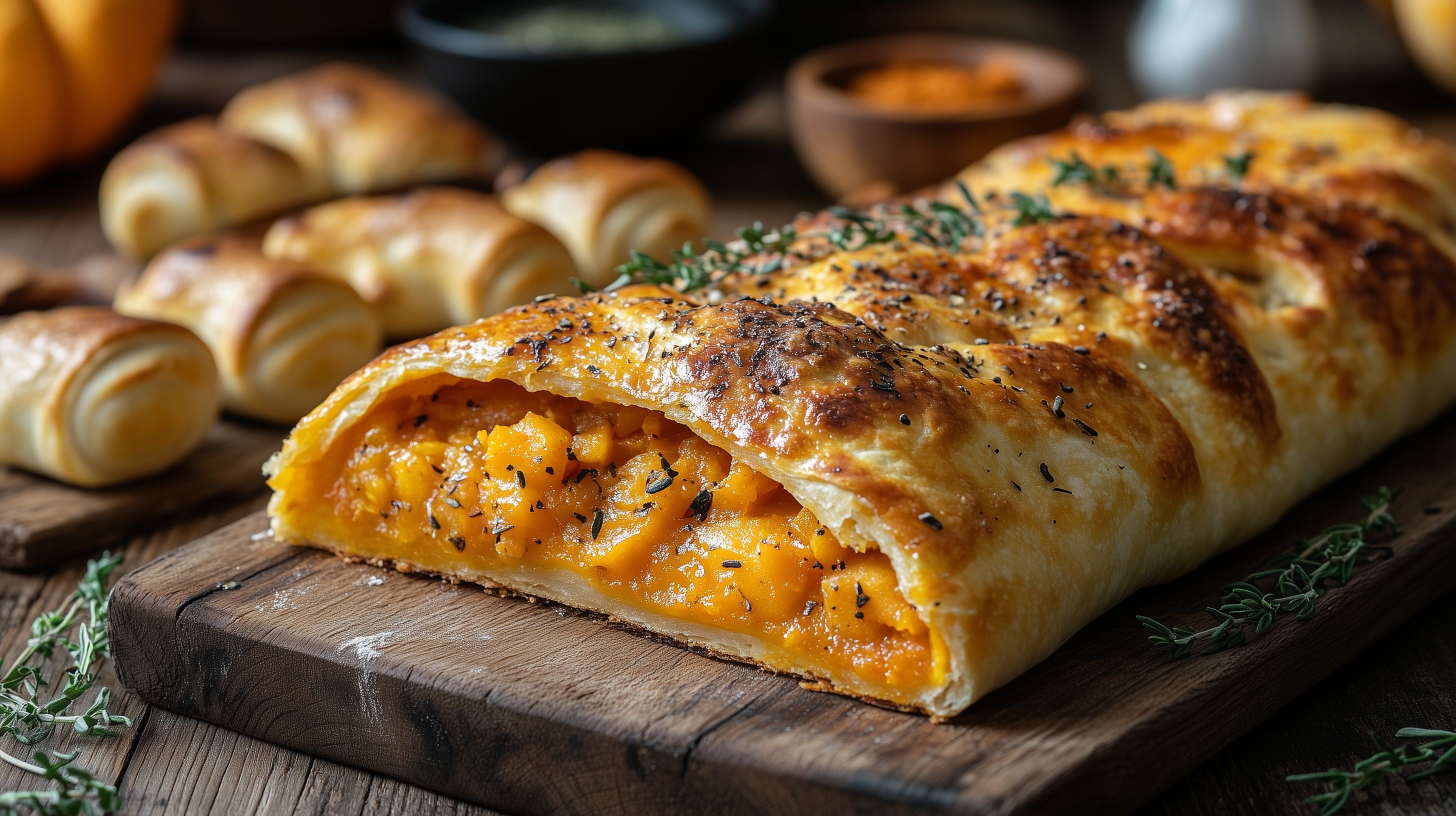 Frisch gebackene Kürbis-Calzone mit aromatischer Füllung