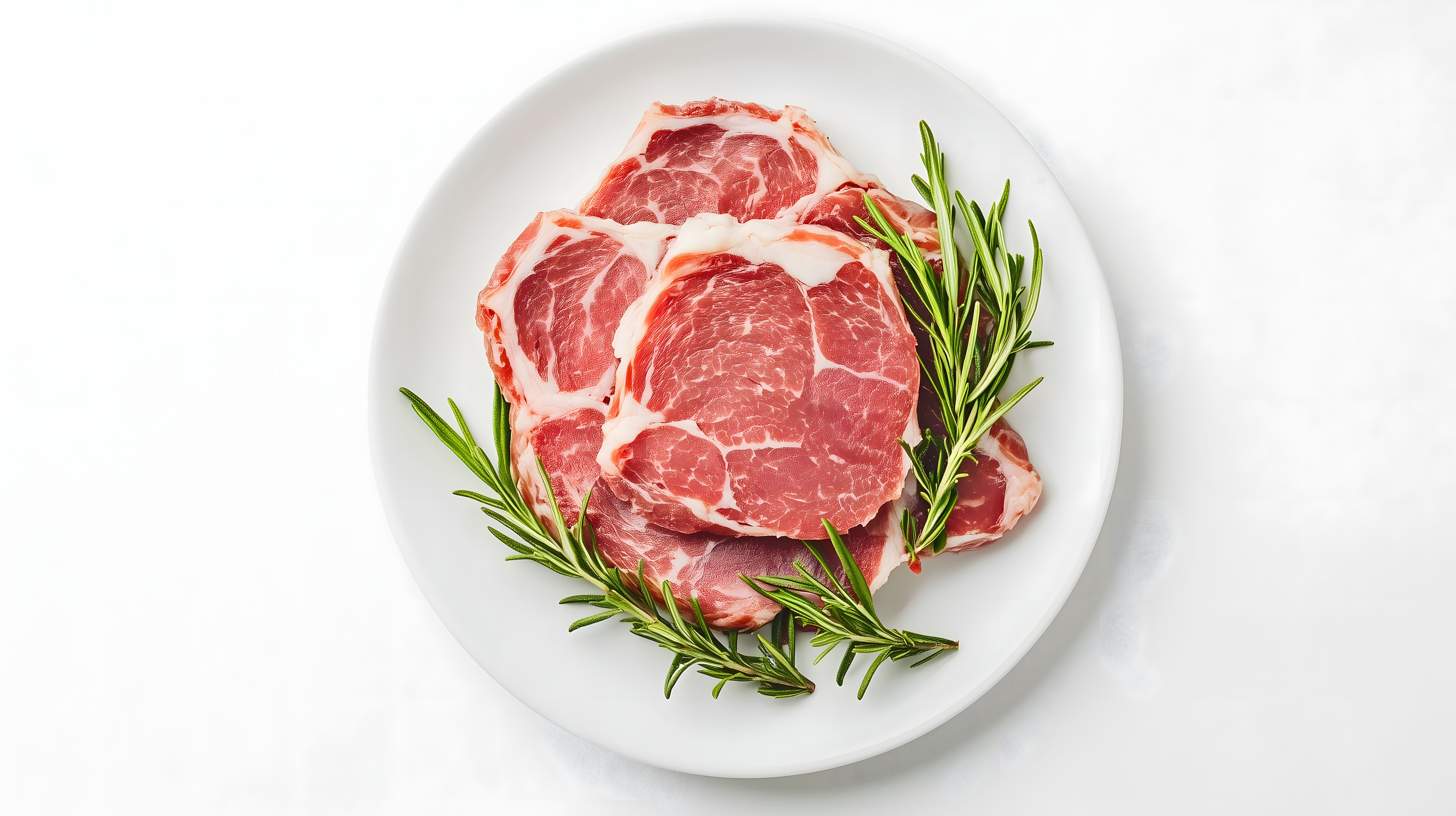 Frische Fleischscheiben mit Rosmarin auf weißem Teller