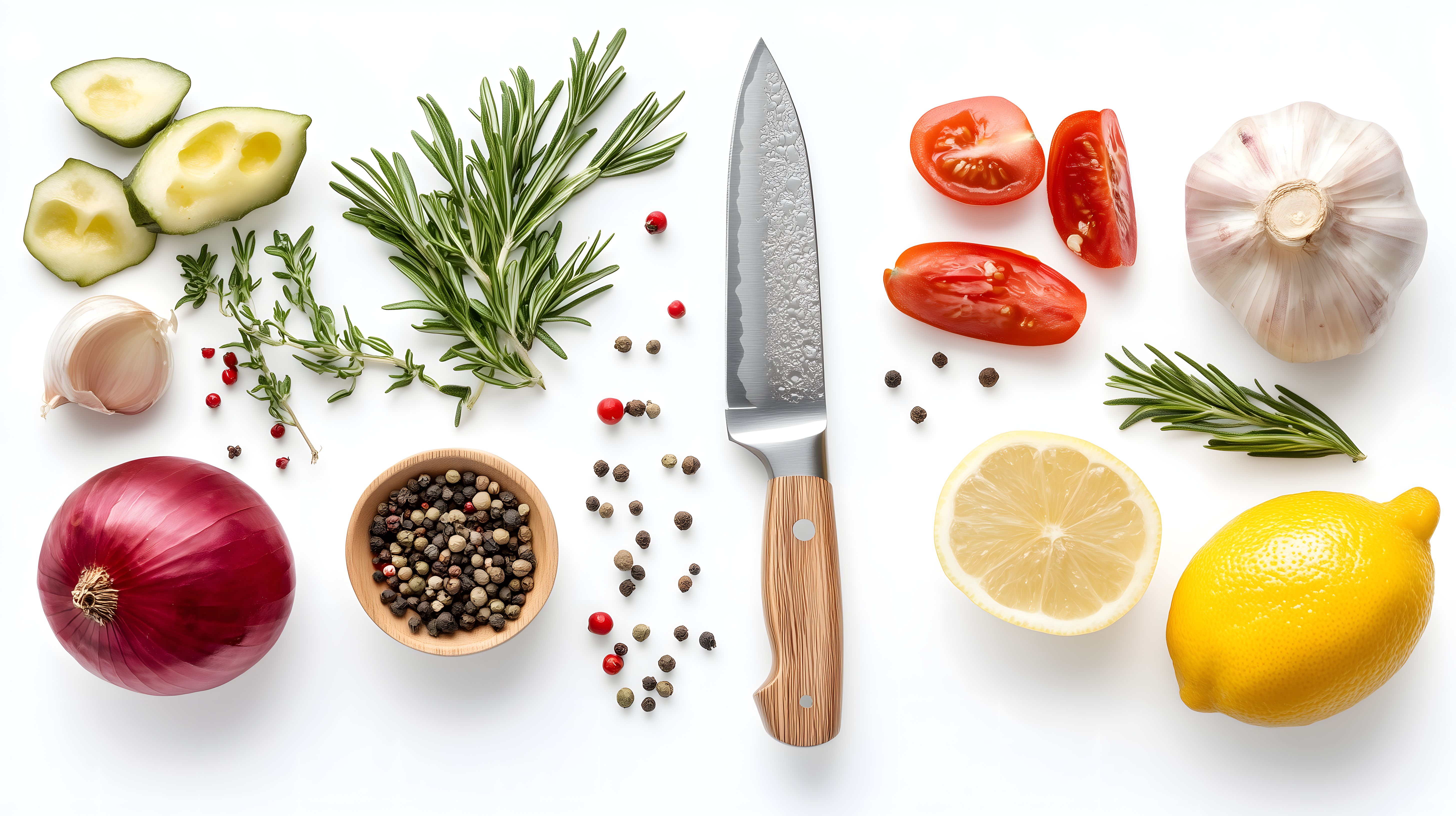 Frische Zutaten und Kochmesser auf weißem Hintergrund