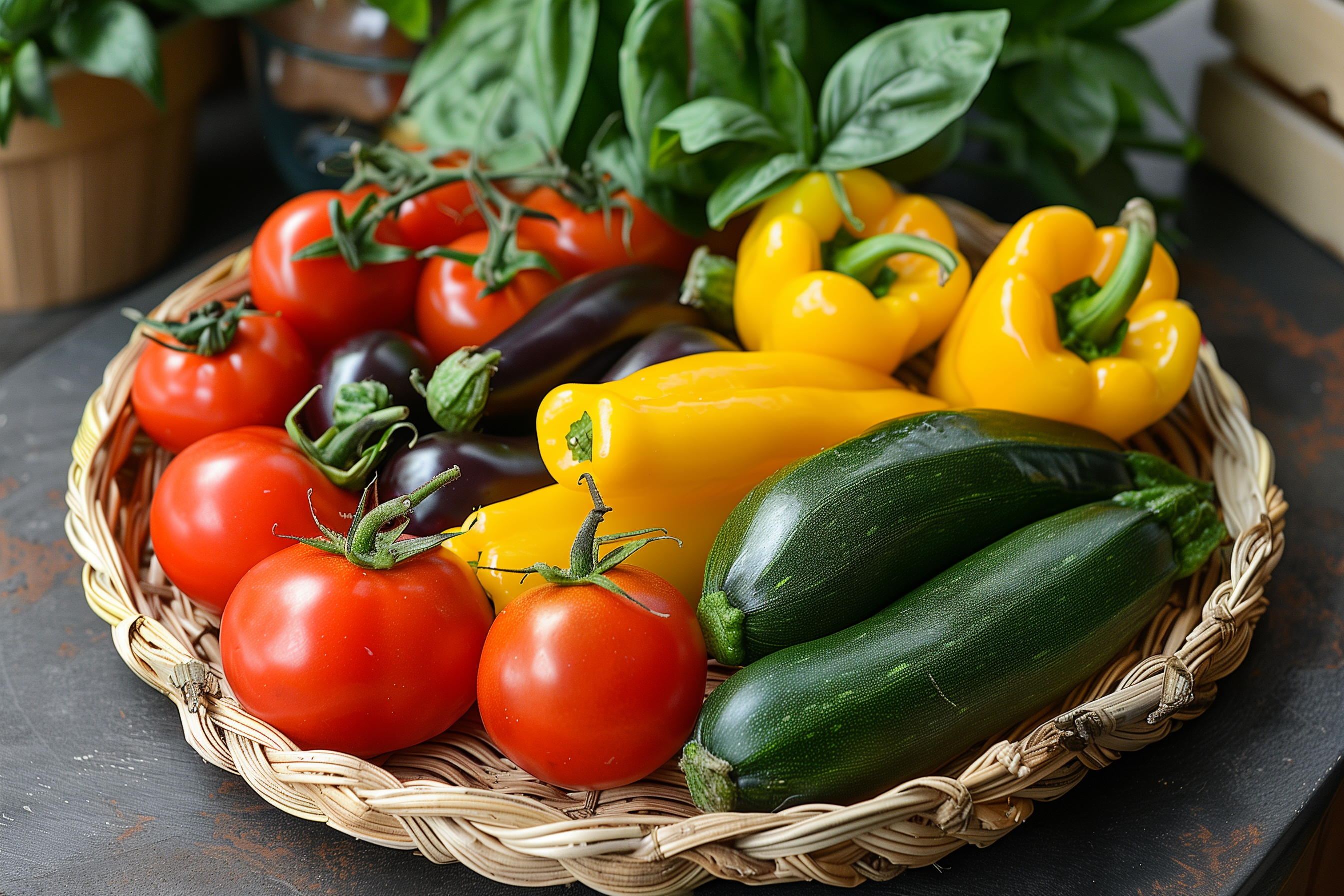 Frisches Gemüse im Korb: Zucchini, Paprika, Auberginen und Tomaten