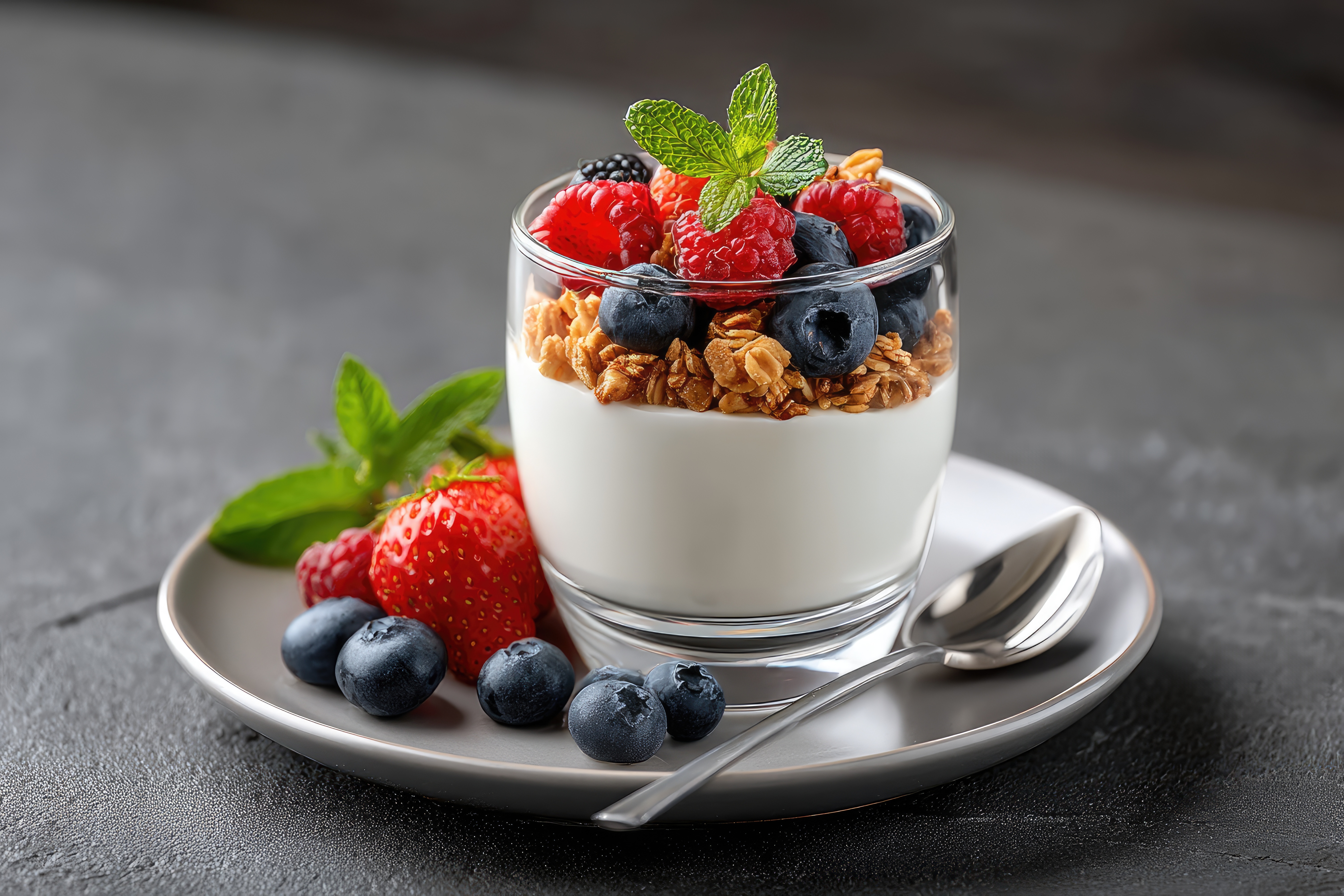 Frisches Joghurt-Dessert mit Beeren, Müsli und Minze im Glas serviert
