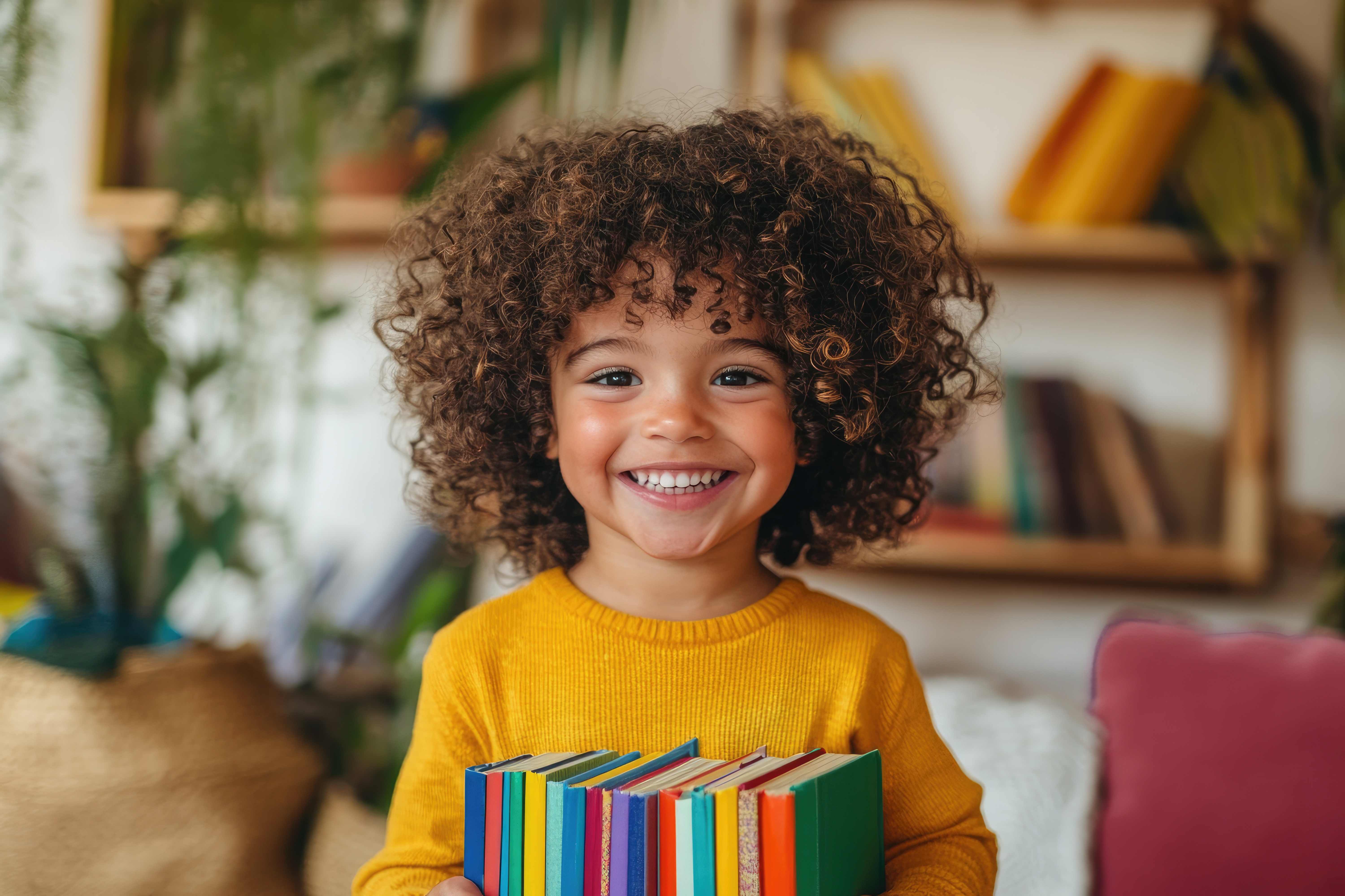Fröhliches Kind mit Büchern in den Händen
