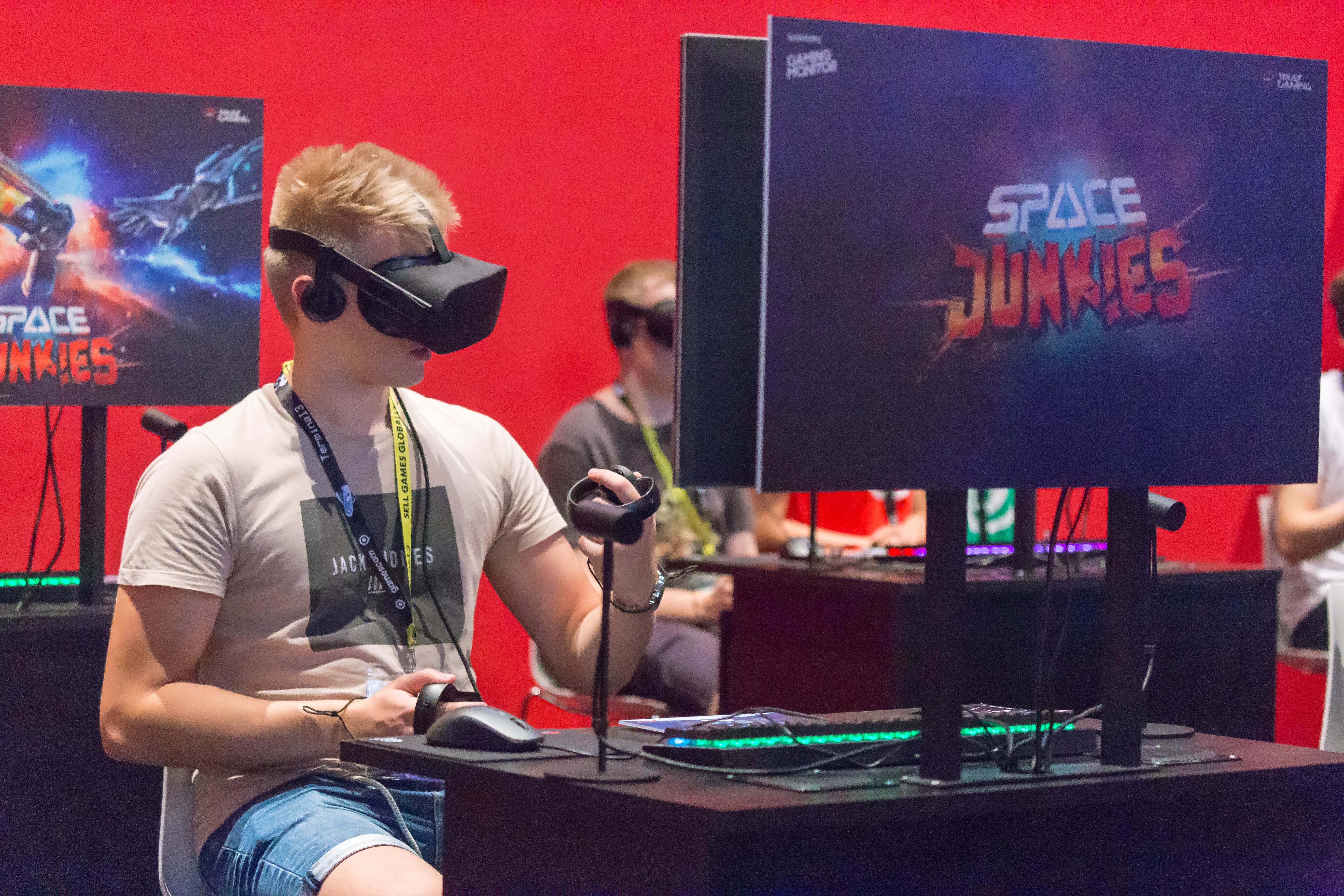 Gamer playing Space Junkies with VR headset and controller