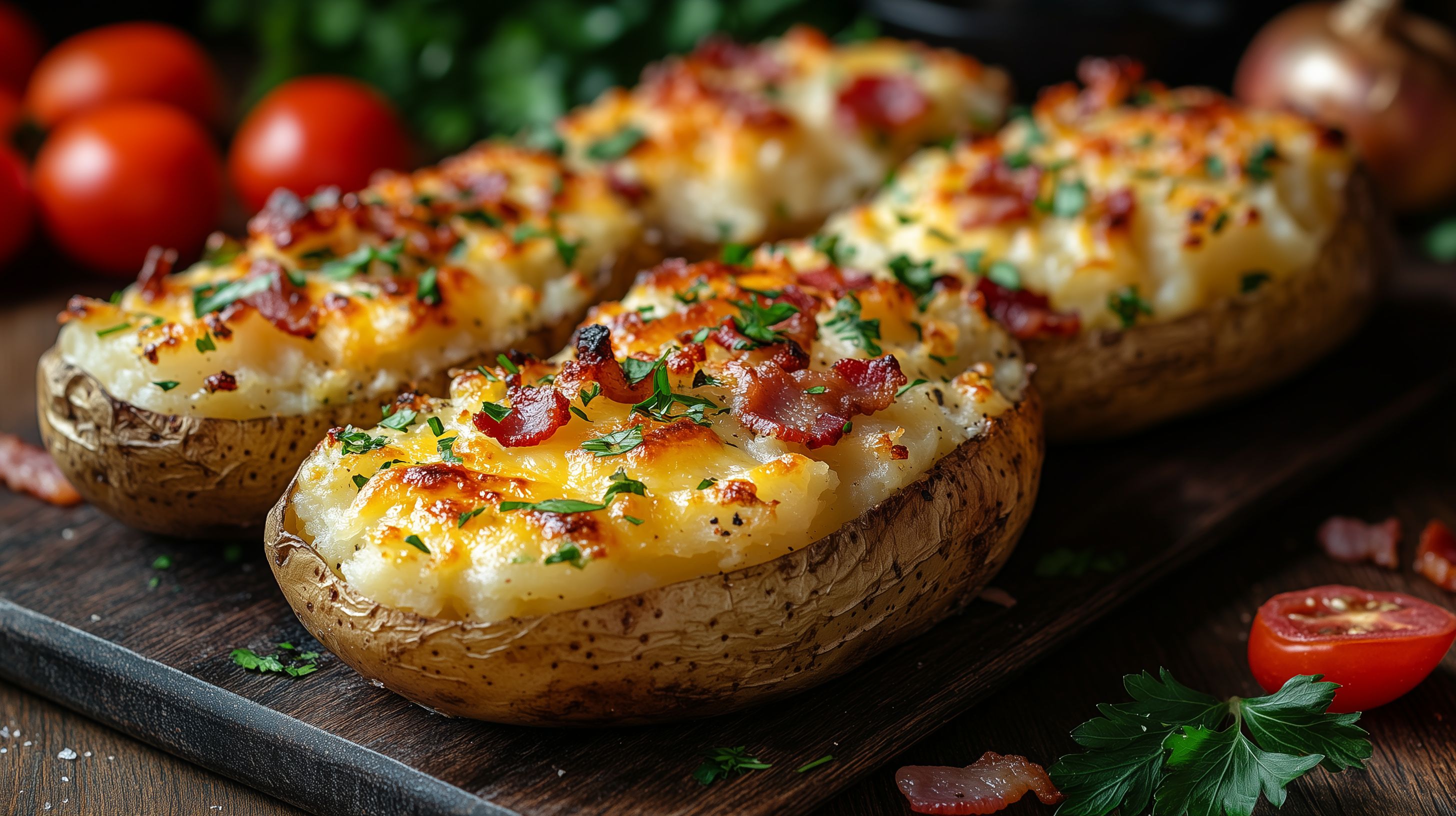Gebackene Kartoffeln mit Käse und Speck auf Holzbrett
