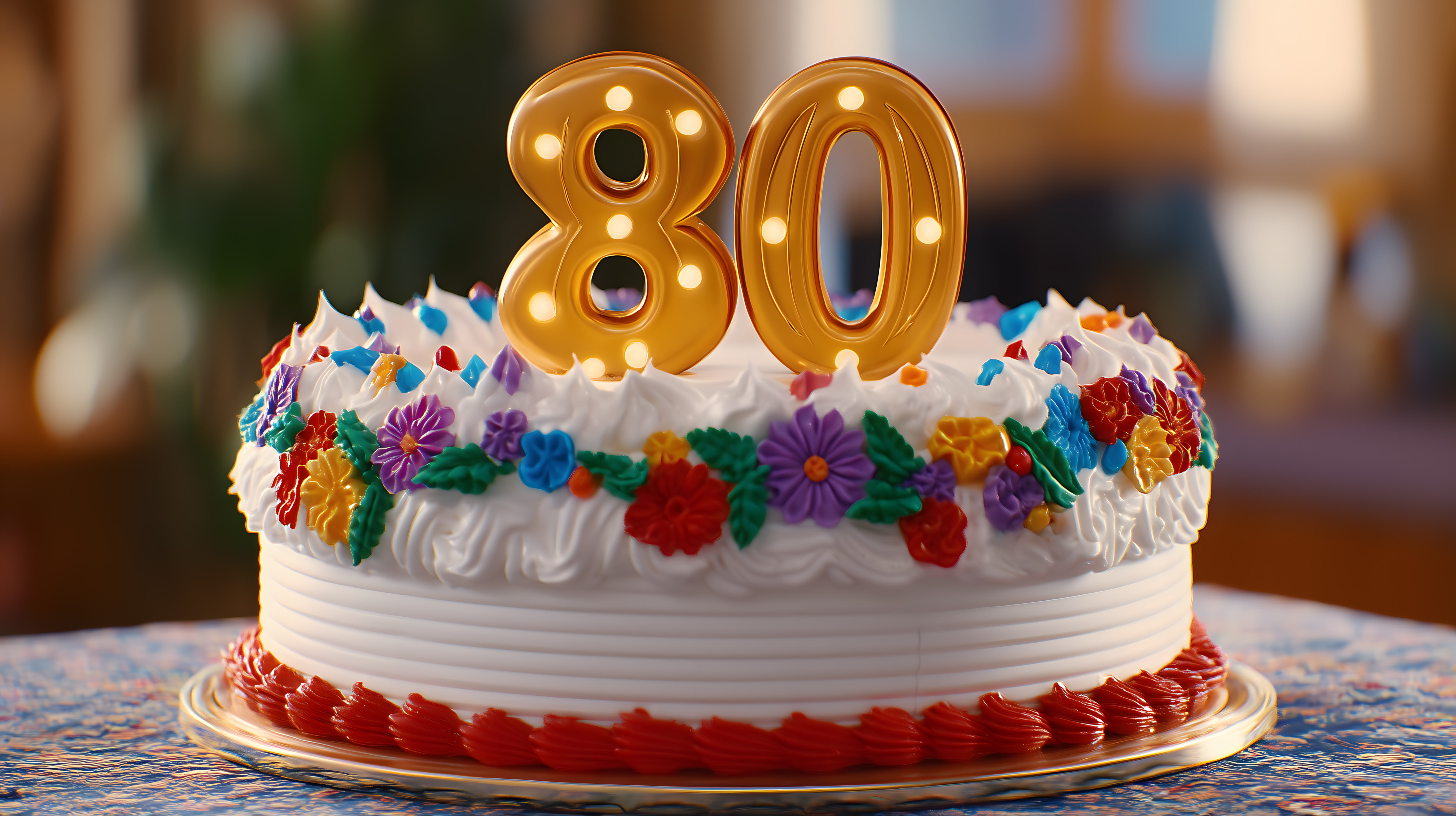 Geburtstagskuchen mit goldenen 80er Zahlen und Blumen