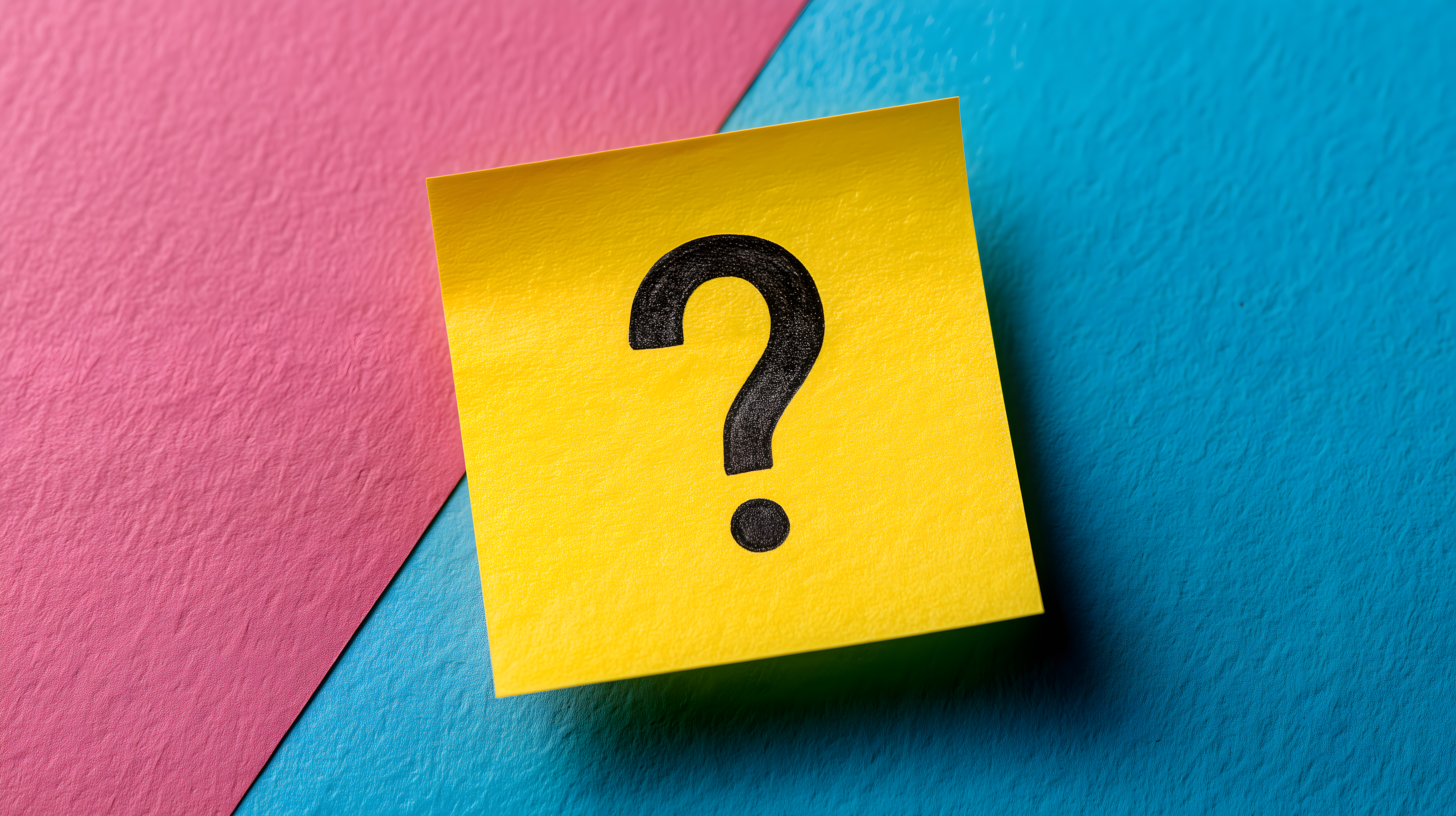 Gelber Notizzettel mit Fragezeichen auf buntem Hintergrund