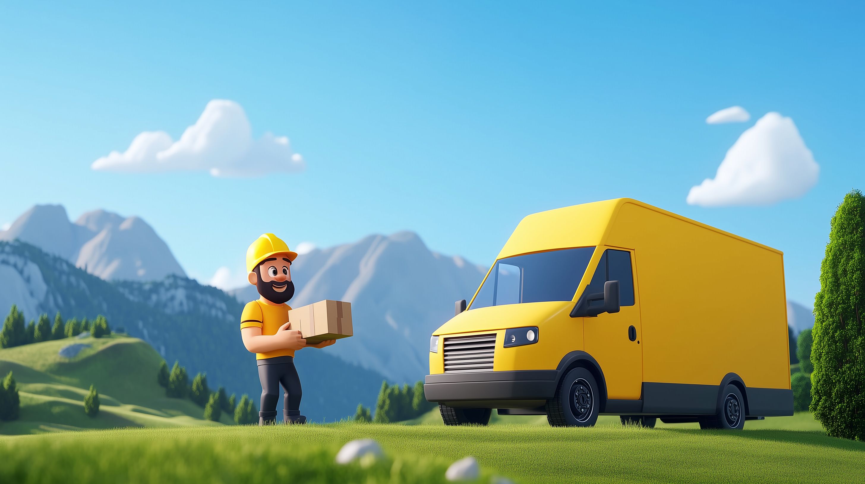 Gelber Paketzusteller wie DHL in mediterraner Umgebung mit Wohnhäusern