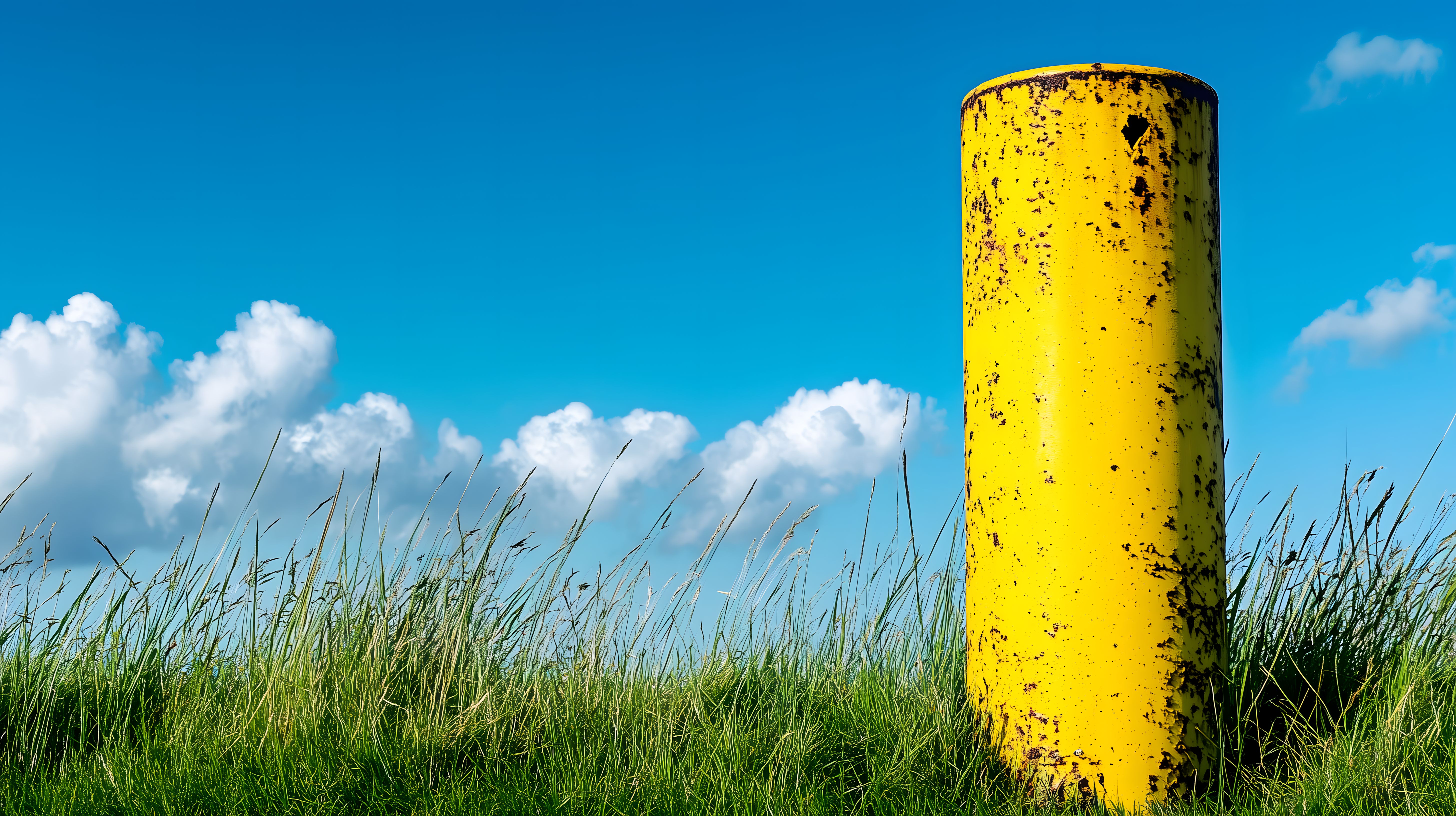 Gelber Pfosten mit verwitterter Textur in einer grünen Wiese