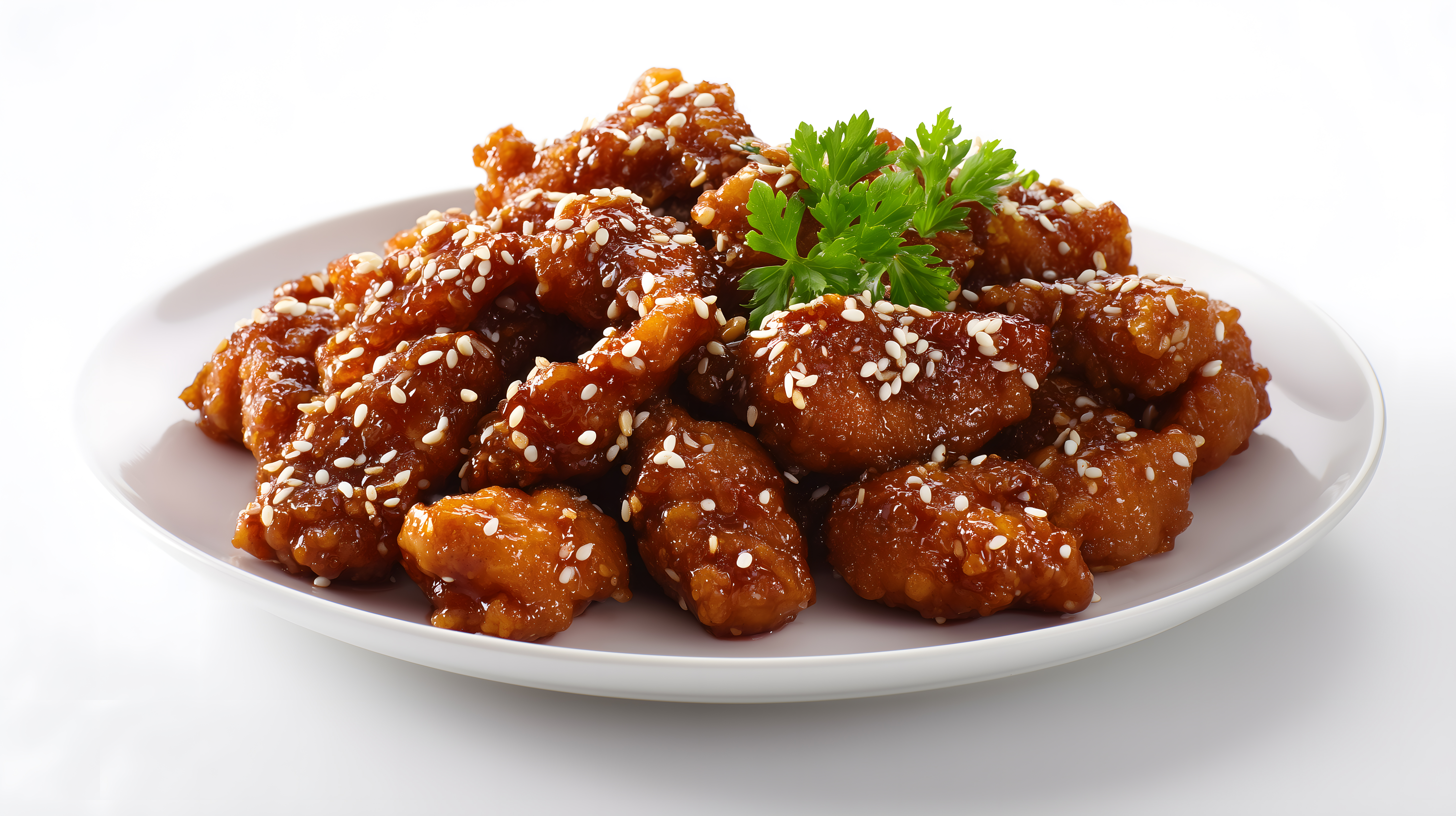 General Tso Hähnchen in süßer Soße mit Sesam und Petersilie auf weißem Teller