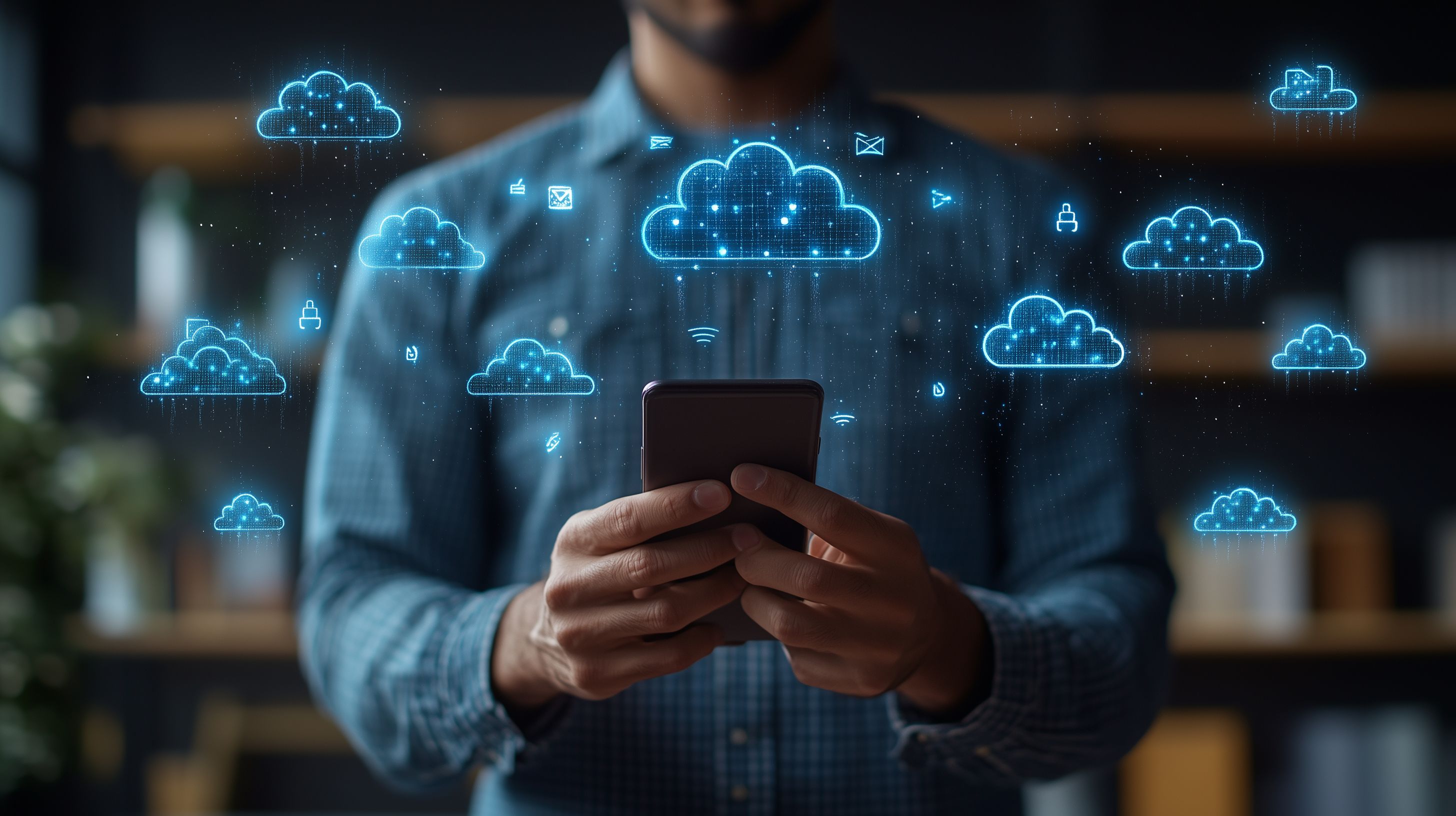 Geschäftsmann hält ein Handy mit digitalen Wolken-Symbolen