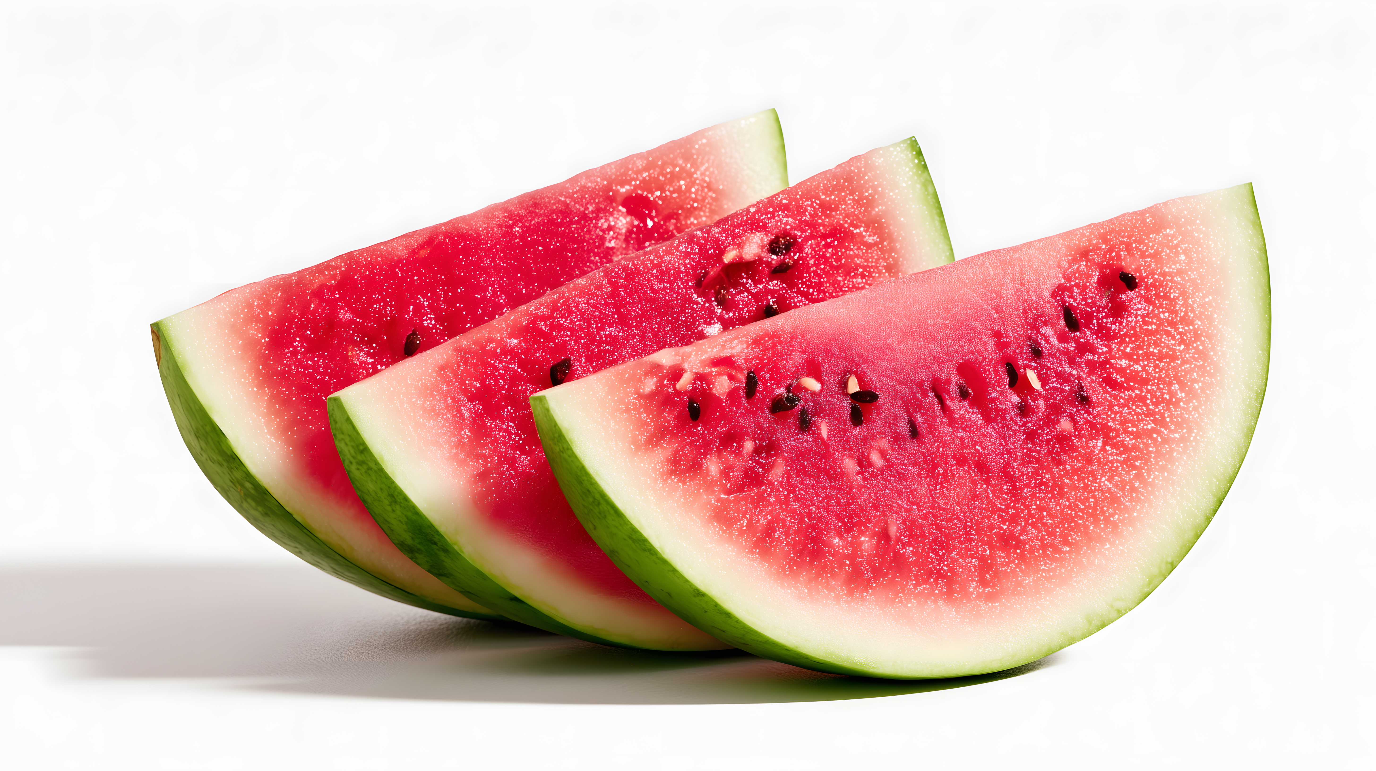 Geschnittene Wassermelonenstücke auf Weiß mit dunklen Kernen