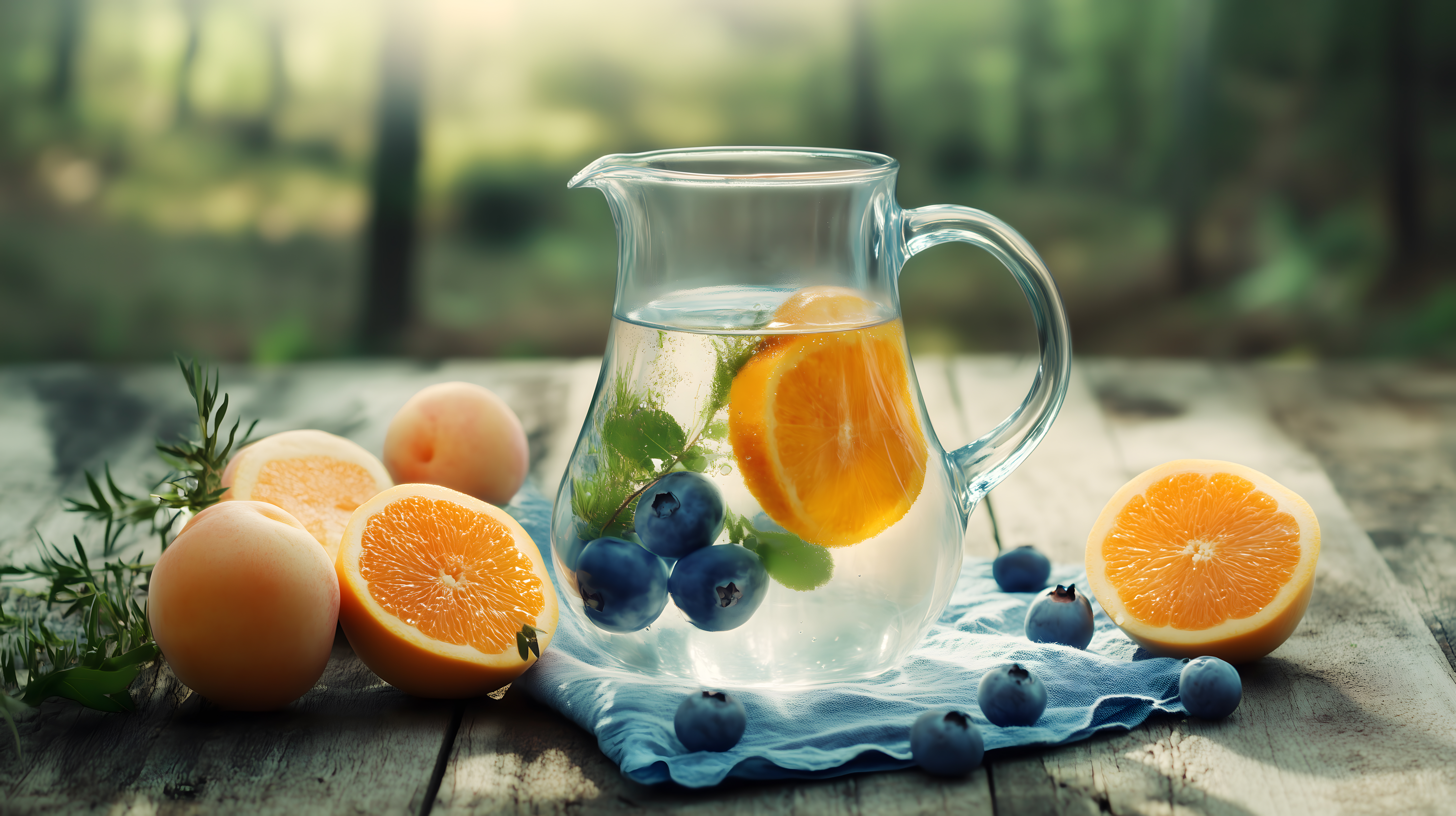 Glaskrug mit Wasser Orange und Blaubeeren auf Holztisch im Garten