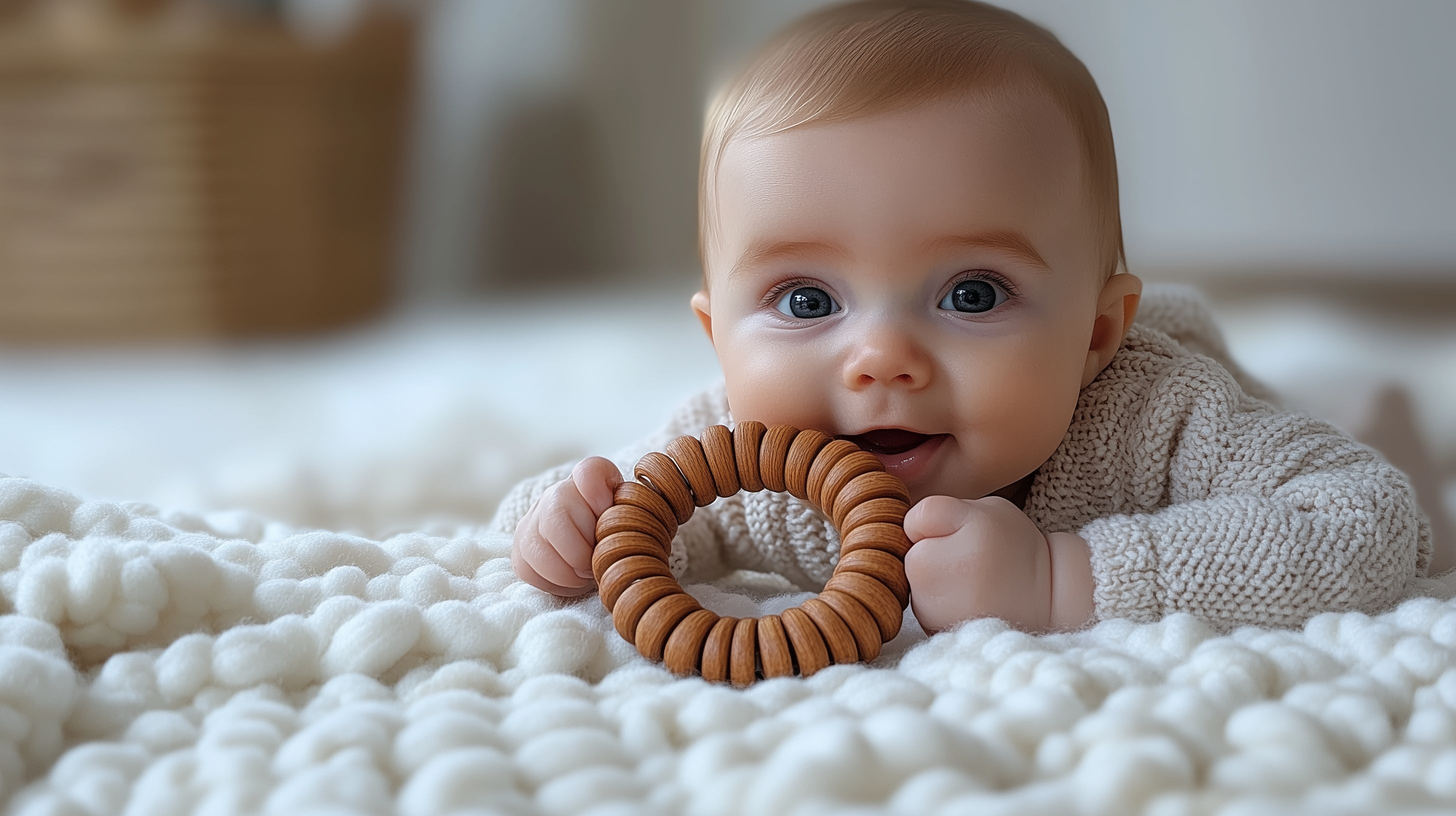 Glückliches Baby mit Holz-Beißring auf weißer Decke