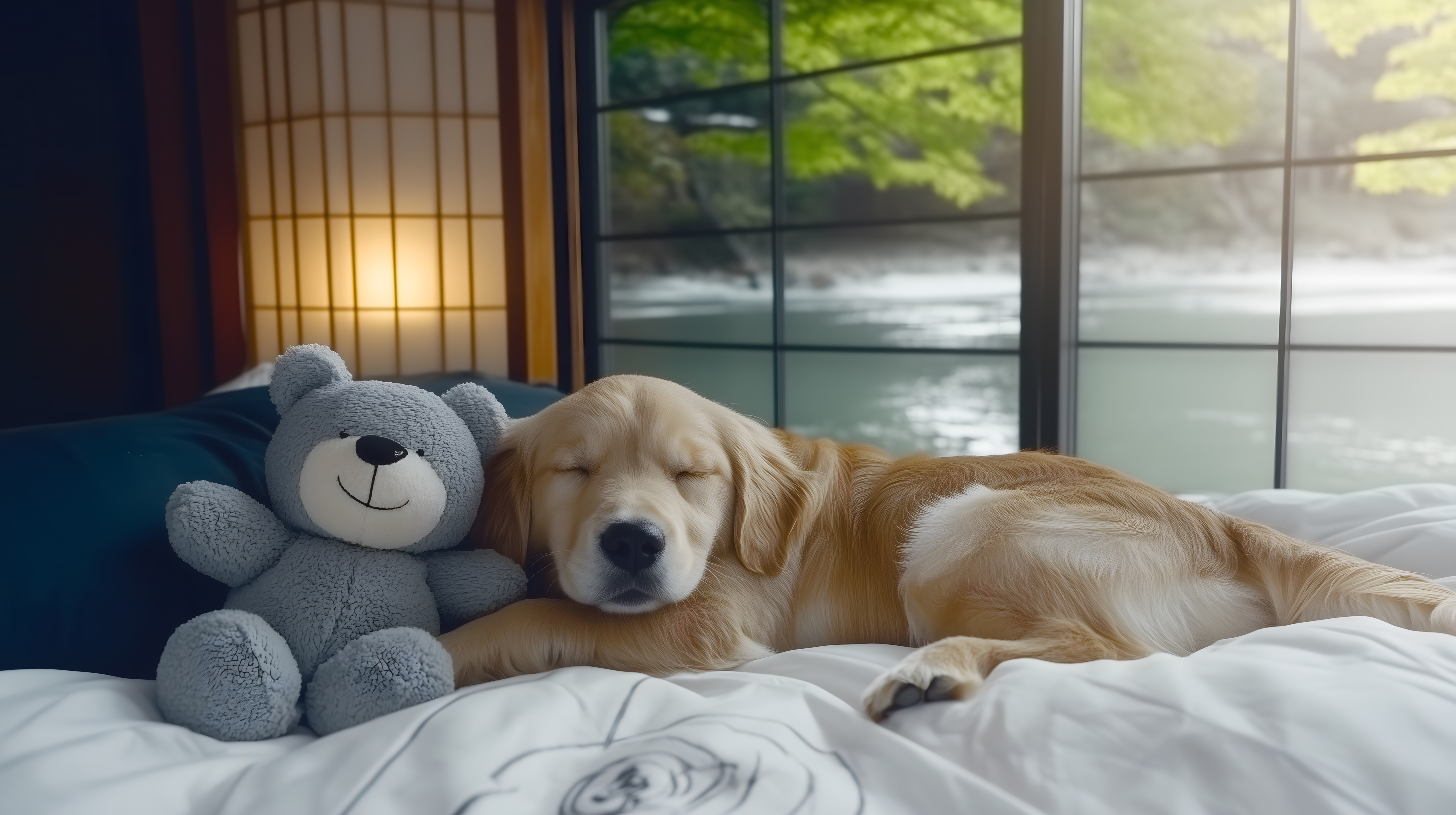 Golden Retriever Welpe schläft gemütlich auf dem Bett