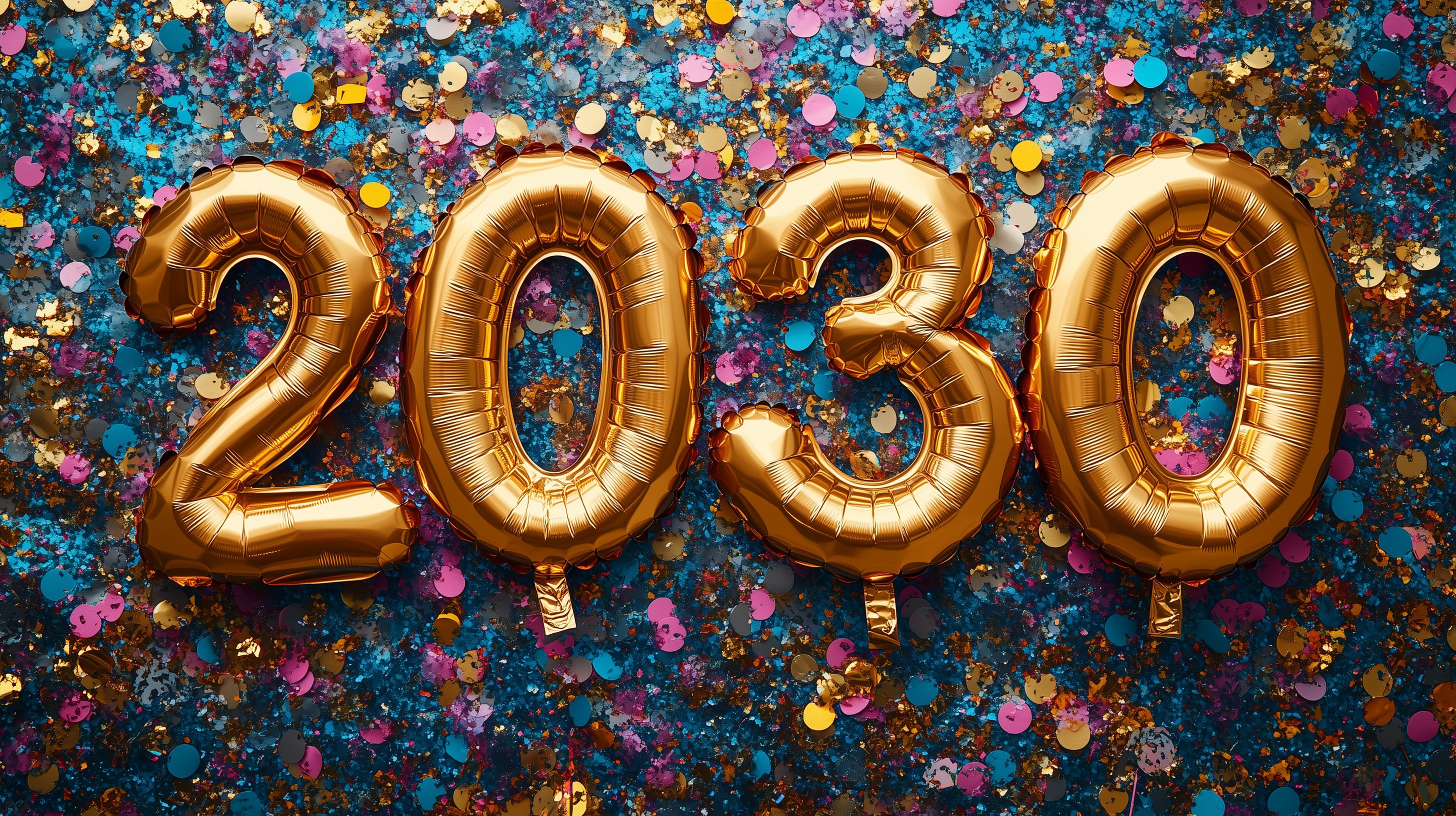Goldene Folienballons 2030 mit farbigem Konfetti