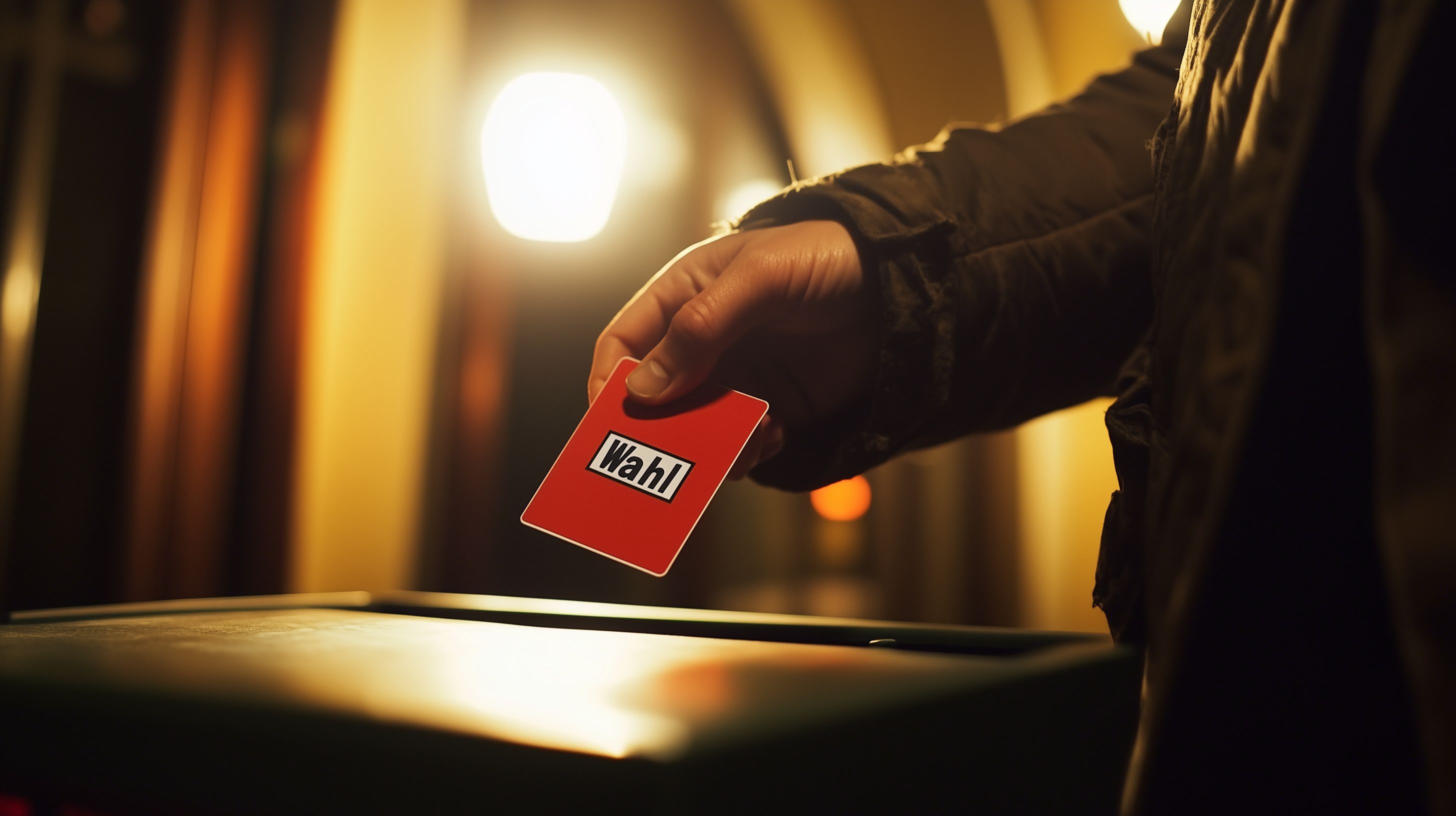 Hand steckt Wahlkarte in Wahlurne bei abendlicher Beleuchtung