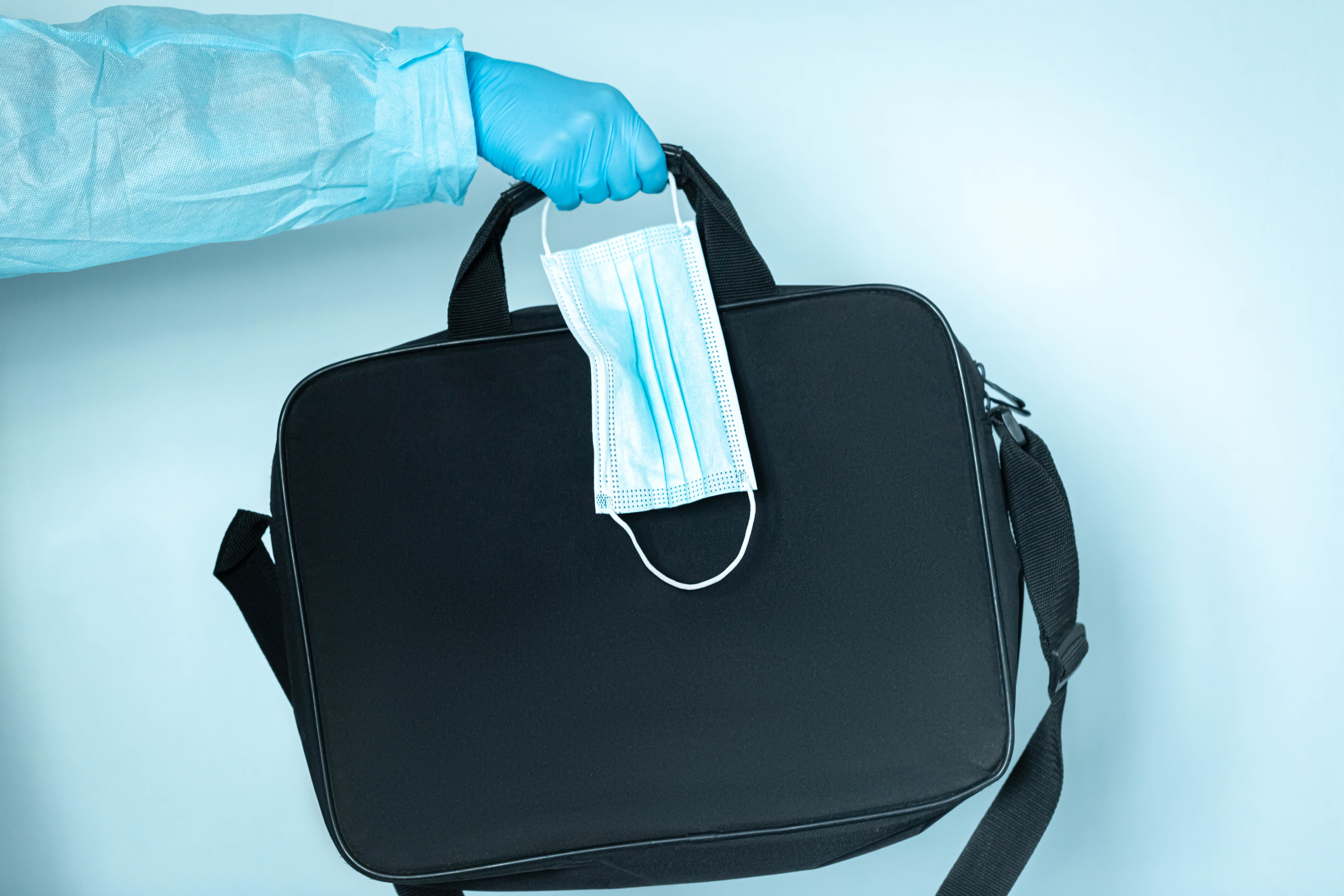 Hand with gloves holding face mask and bag, medical and healthcare concept