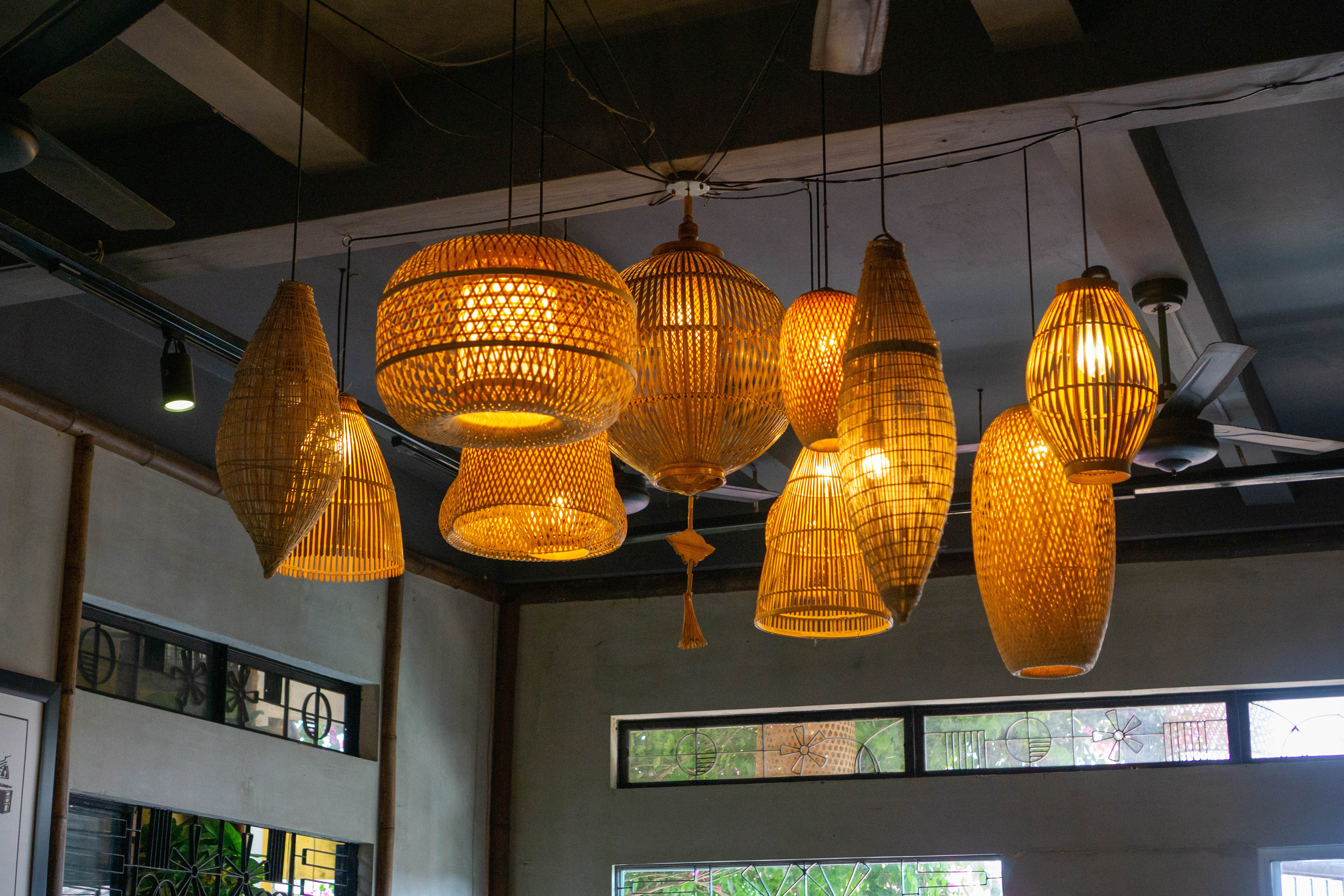 Hanging Bamboo Lamps in different Shapes with Light Bulbs inside a Restaurant and Cafe in Hoi An, Vietnam