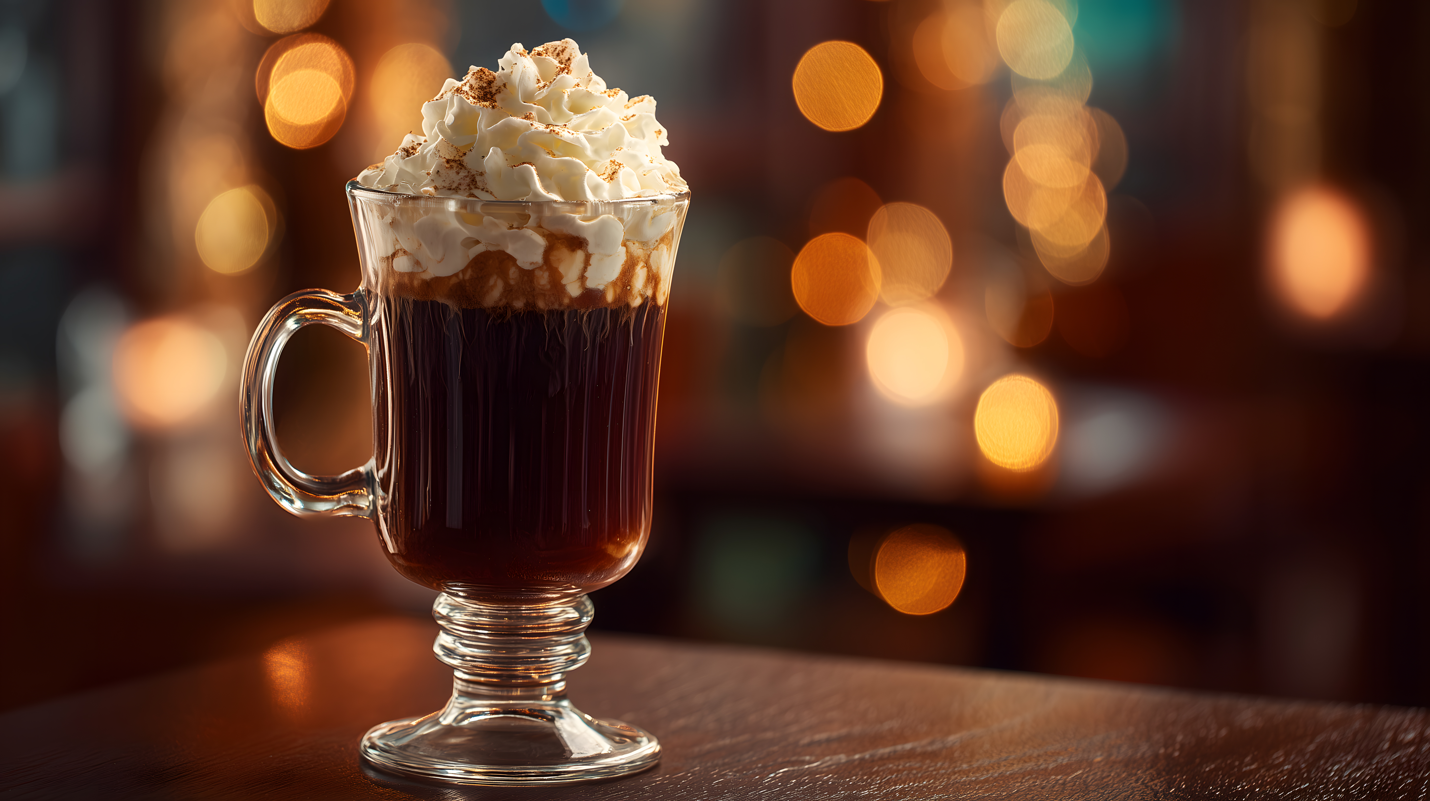 Irish Coffee mit Schlagsahne im Café bei Abendlicht