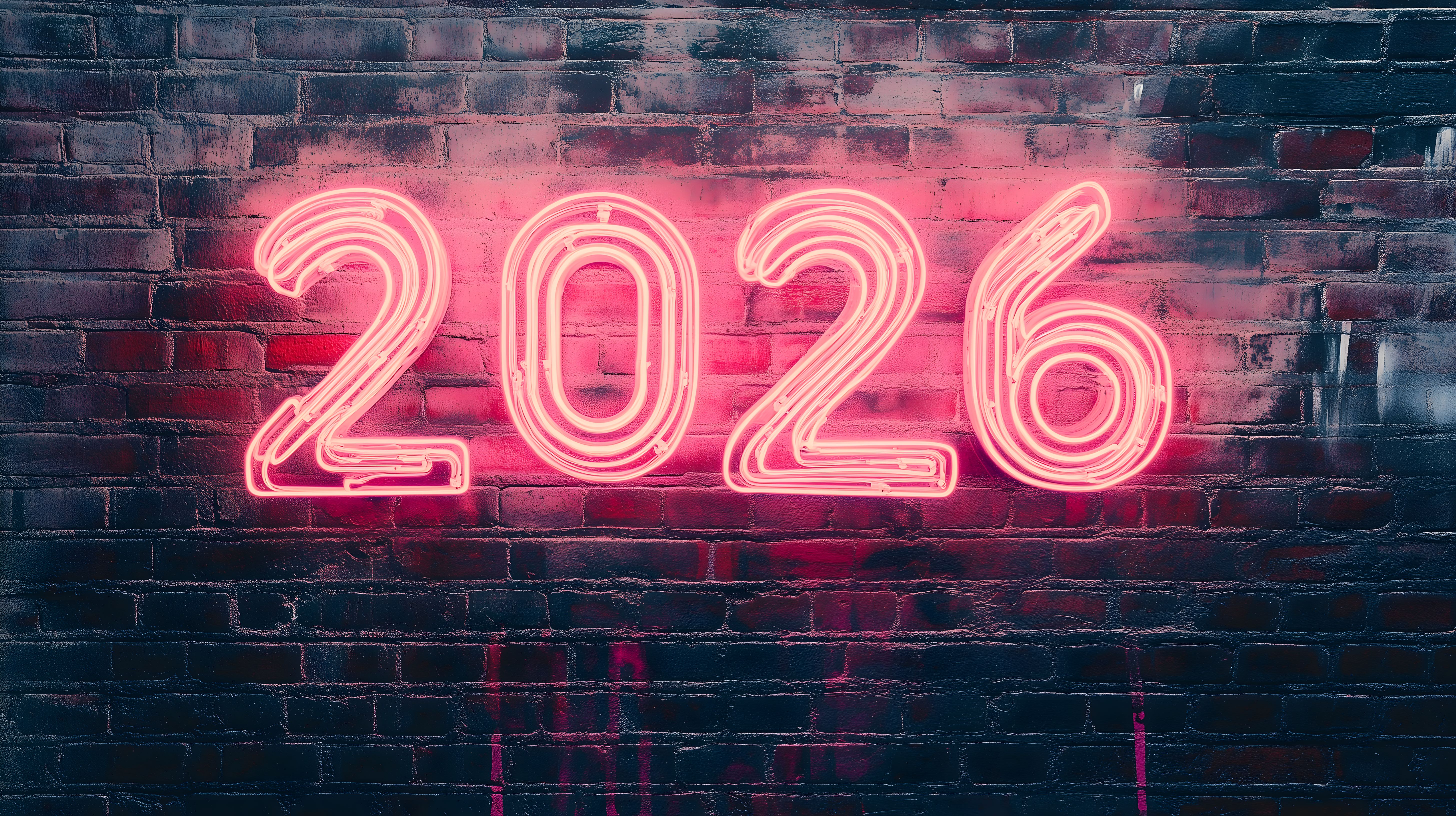 Jahreszahl 2026 in kräftigem Pink auf Ziegelwand