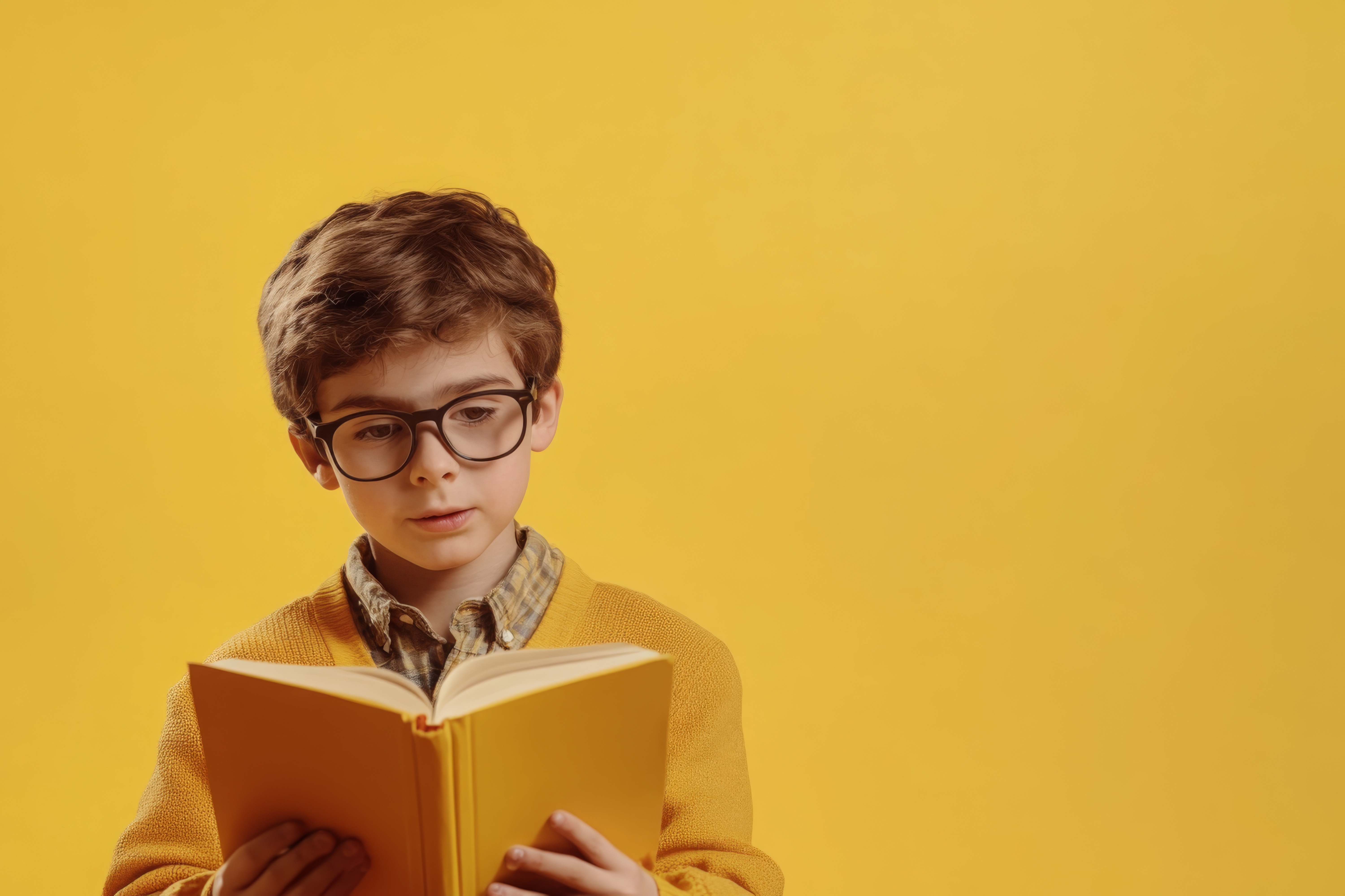 Junge liest ein gelbes Buch vor einen gelben Hintergrund