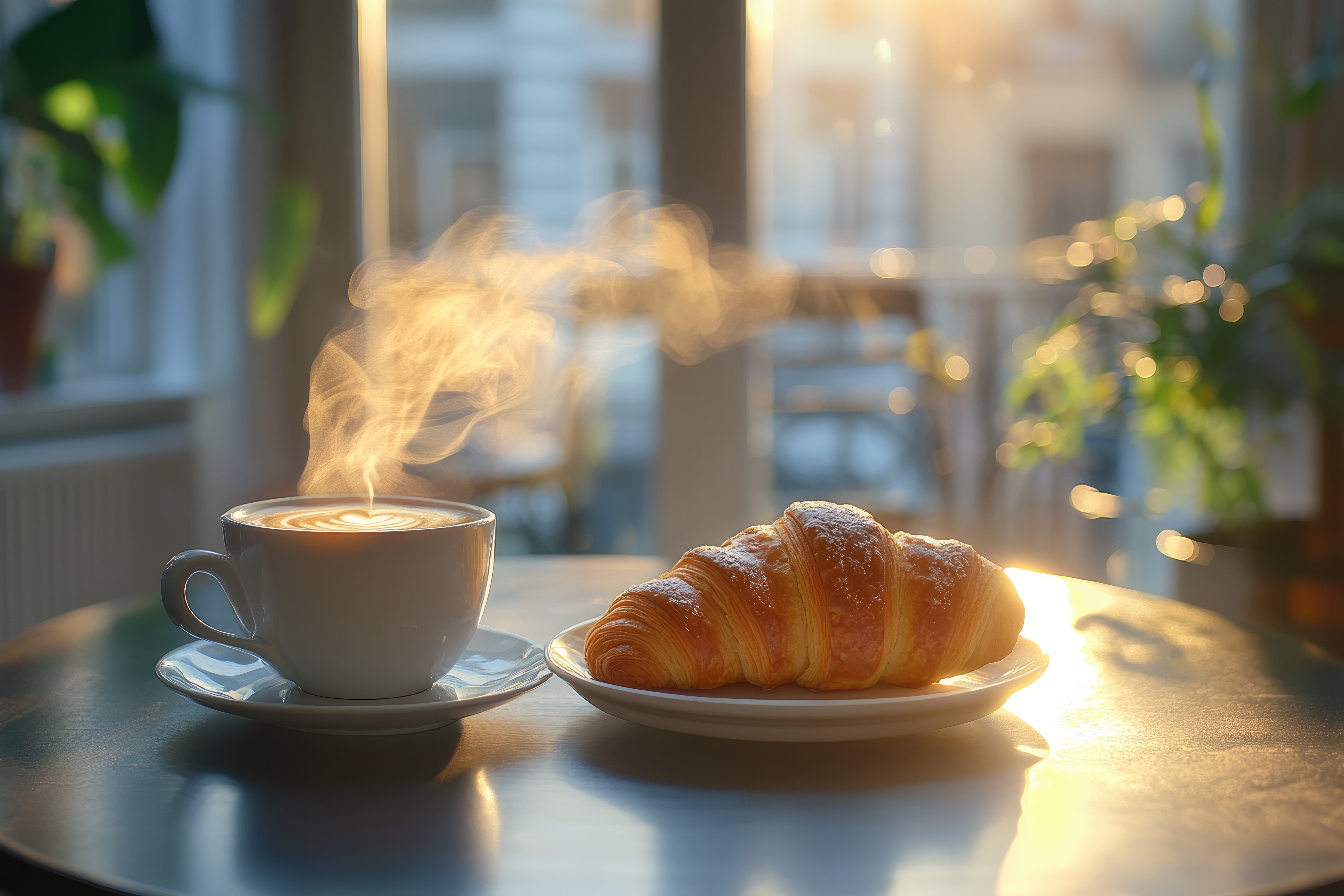 Kaffee und Croissant im Morgenlicht