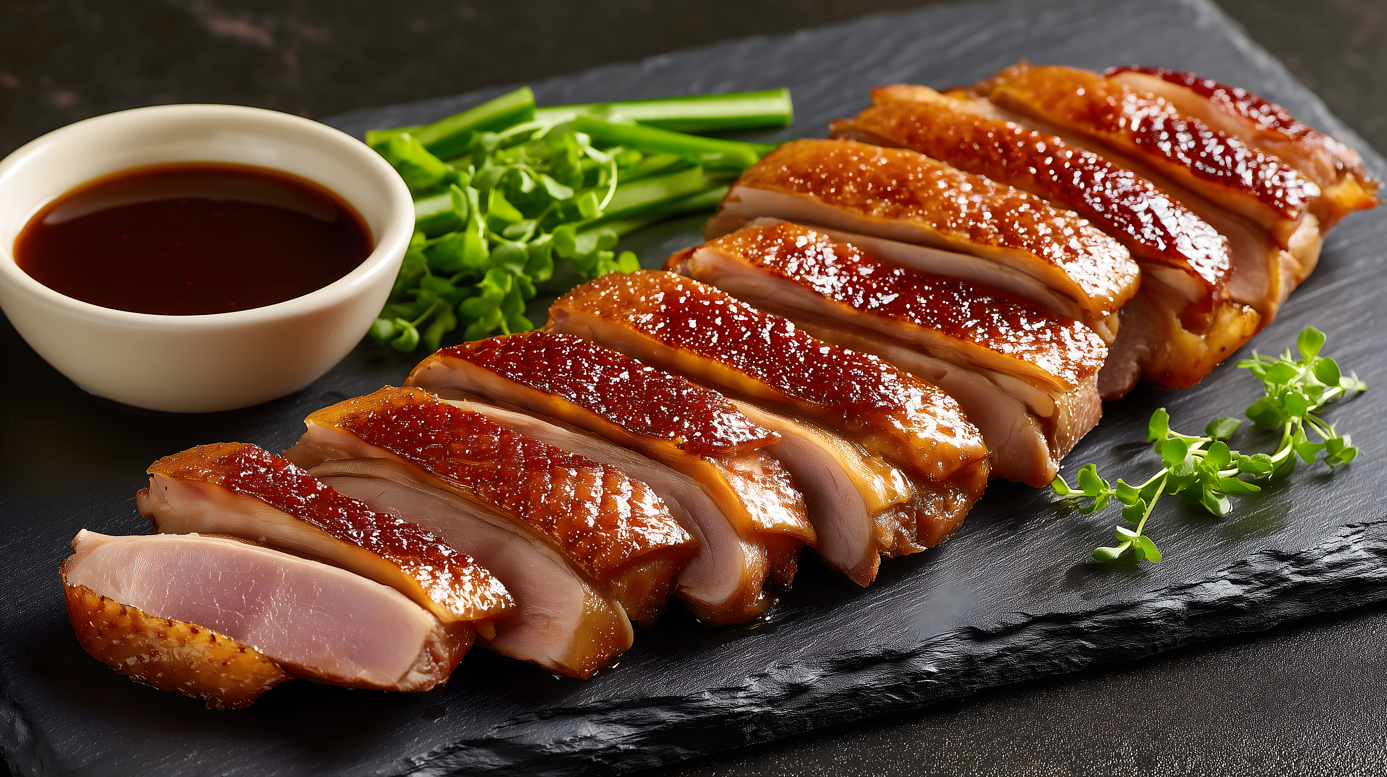 Kantonesische Ente aufgeschnitten mit Soße und Frühlingszwiebeln