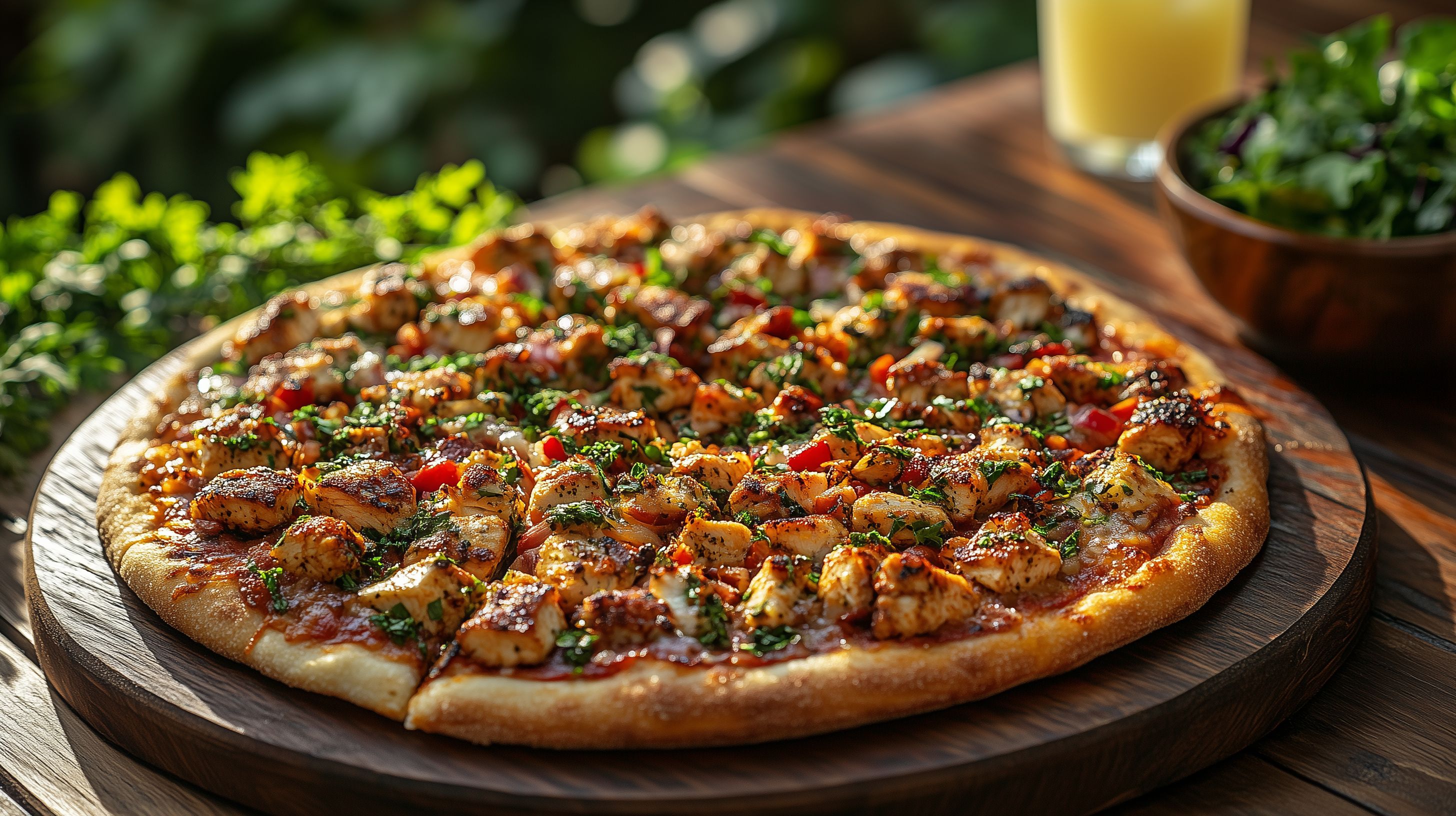 KI-Pizza mit gegrilltem shawarma Hähnchen und Kräutern auf rustikalem Holztisch