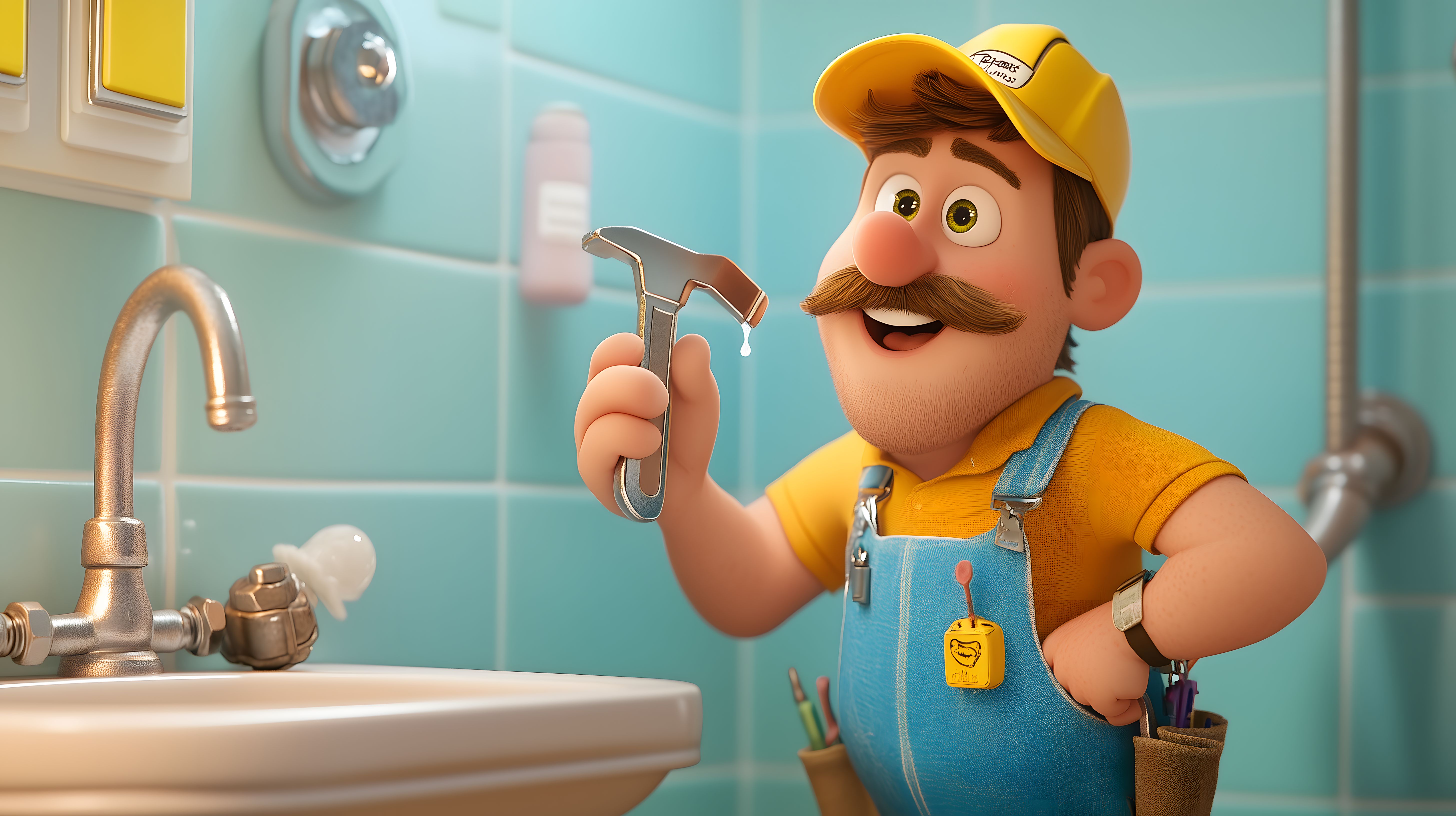 Klempner hält einen Schraubenschlüssel und repariert ein undichtes Rohr im Badezimmer