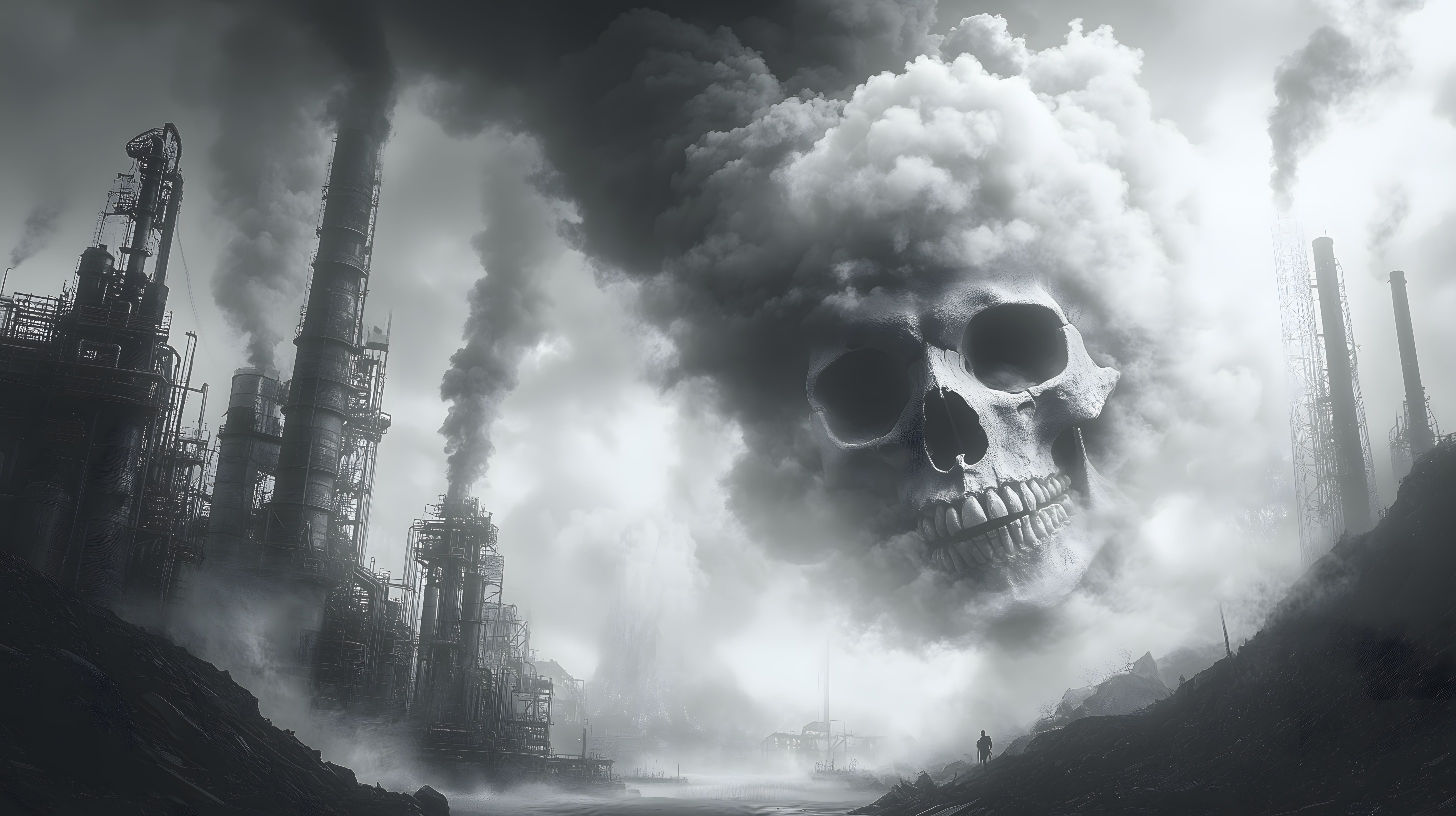 Klimawandel: Bedrohlicher Rauchschädel über Fabriklandschaft