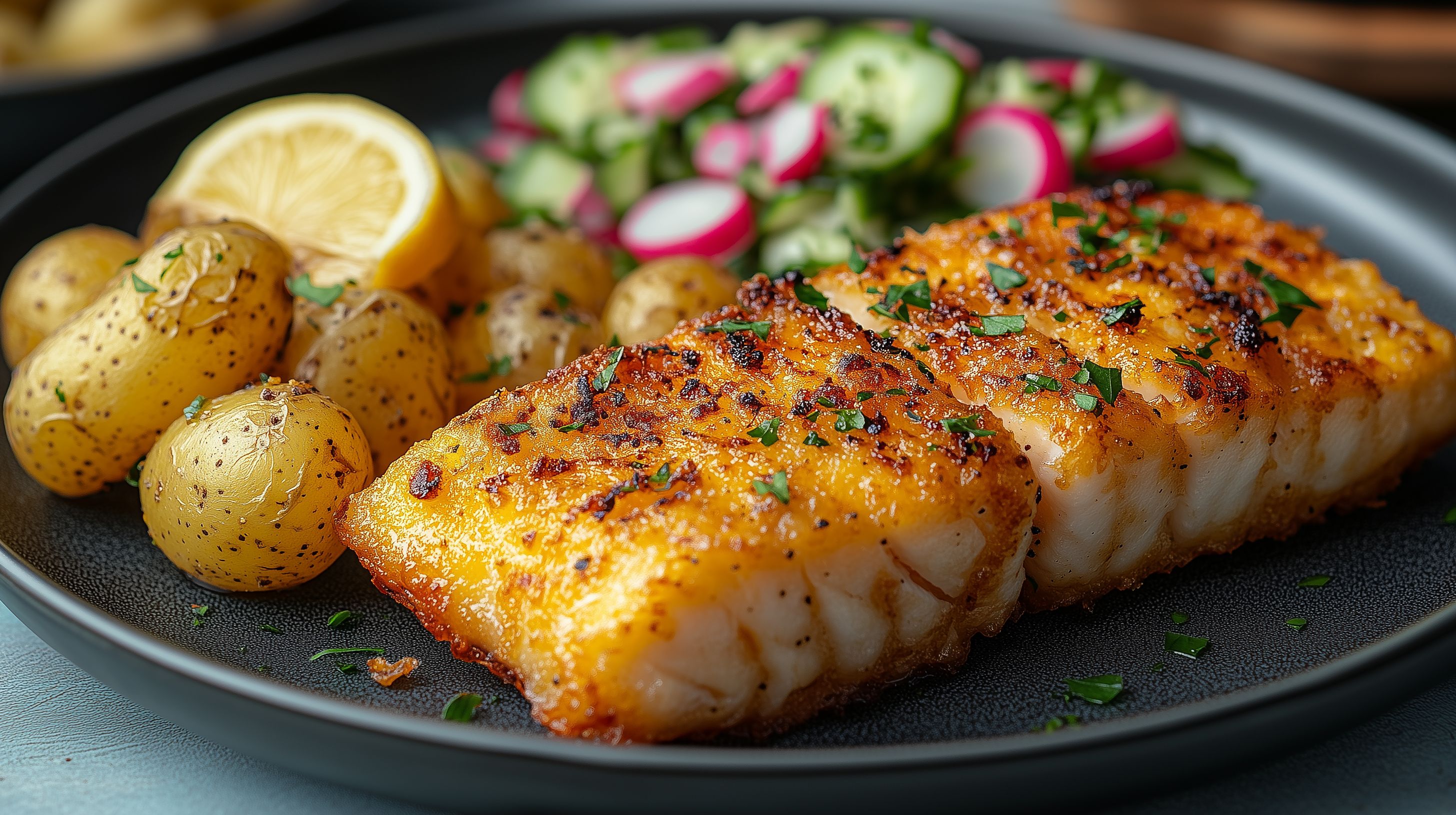 Knusprig gebratener Fisch mit Kartoffeln und frischem Salat