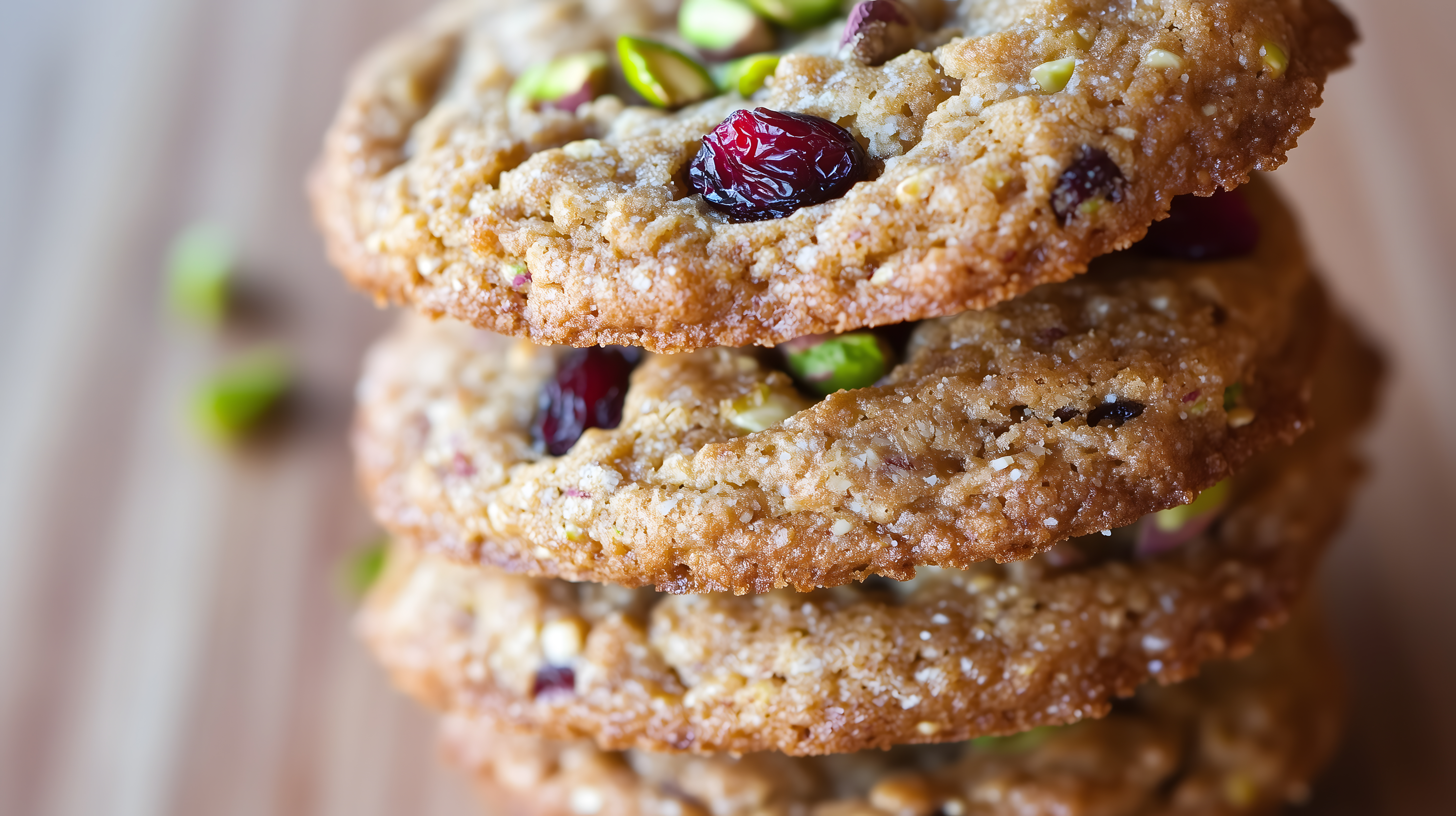 Knusprige Cookies mit Pistazien und Cranberries gestapelt auf Holzuntergrund