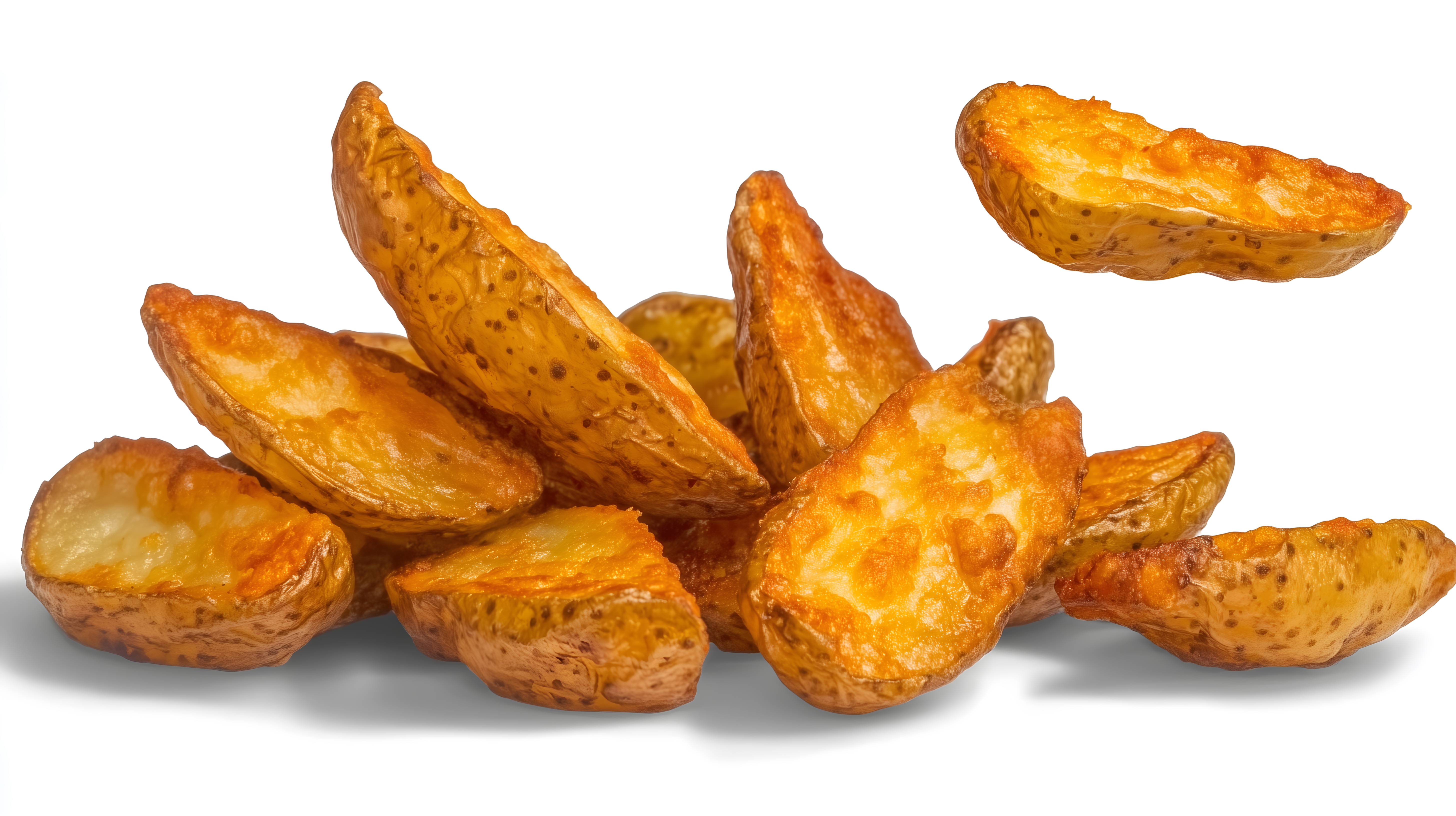 Knusprige Kartoffelwedges fliegend auf weißem Hintergrund