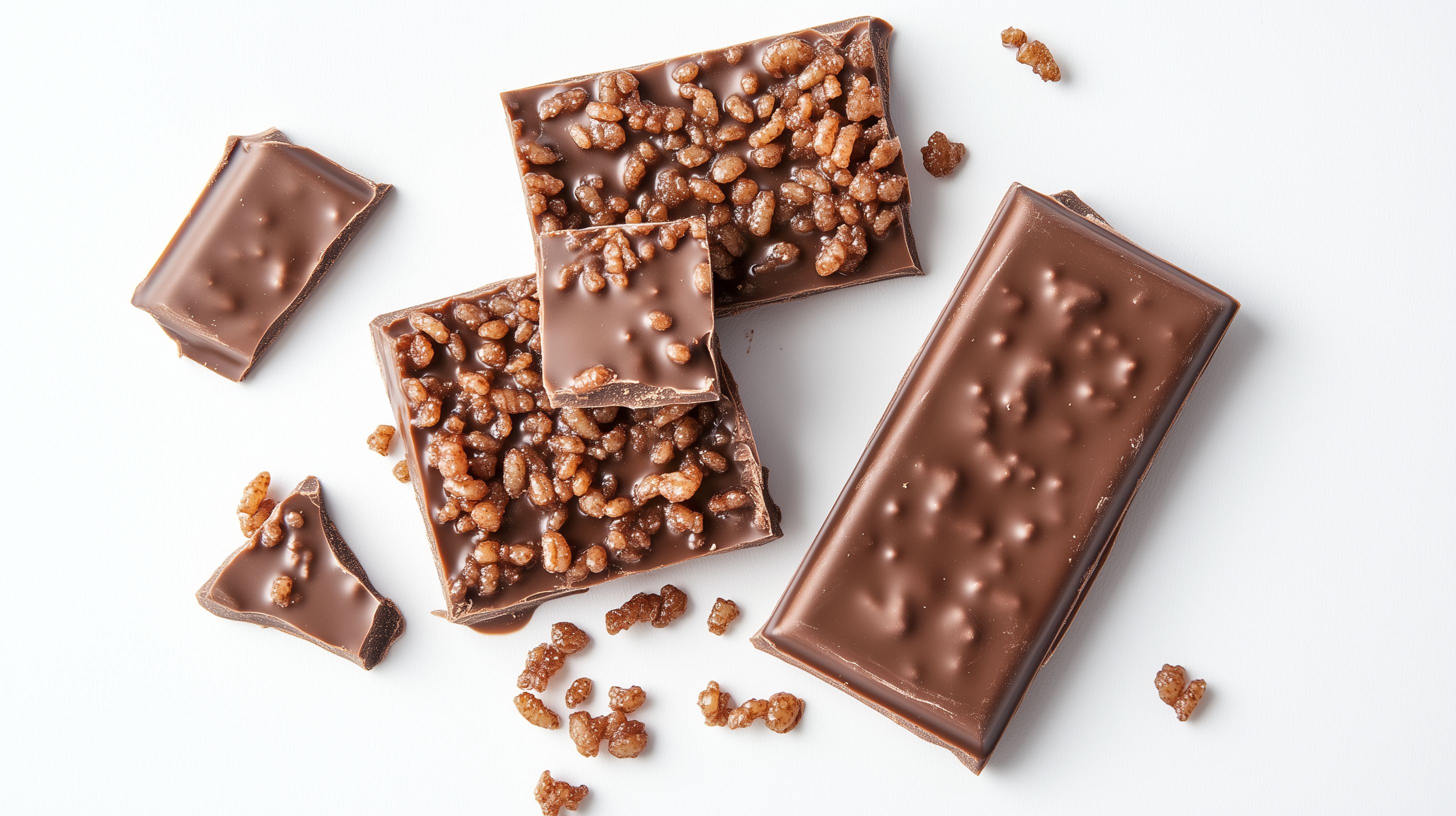Knusprige Schokolade mit Reisstückchen auf weißem Hintergrund