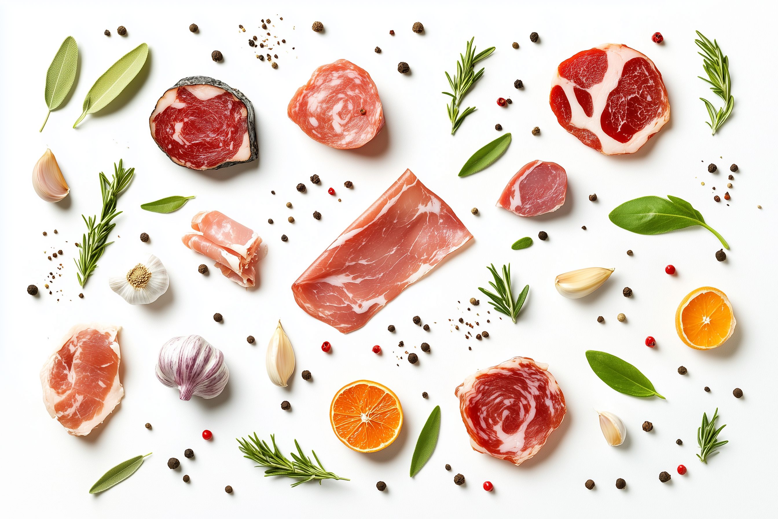 Kreatives Flatlay von verschiedenen Schinken- und Fleischsorten mit Gewürzen