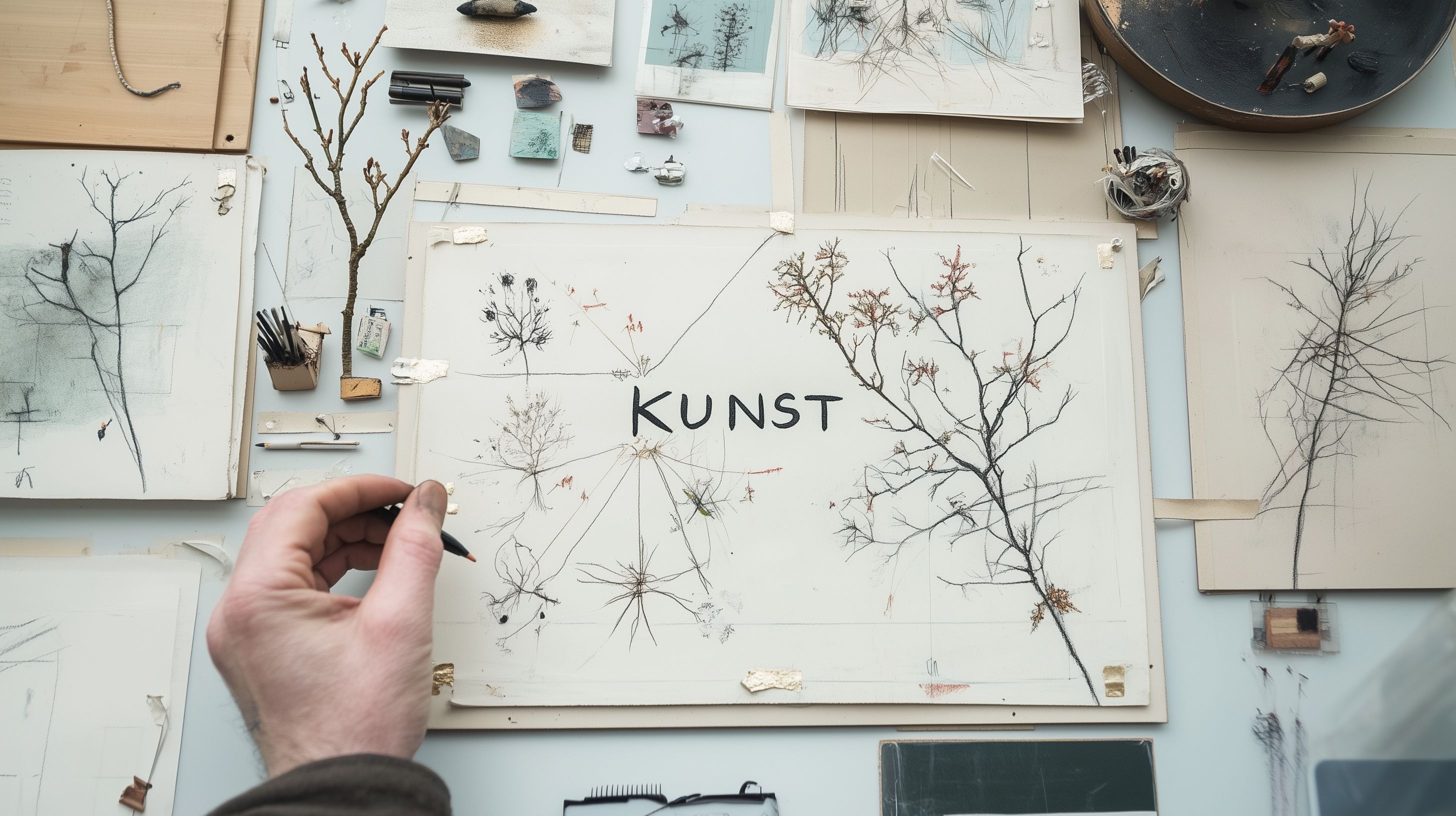 Kunst Collage mit botanischen Zeichnungen und Objekten