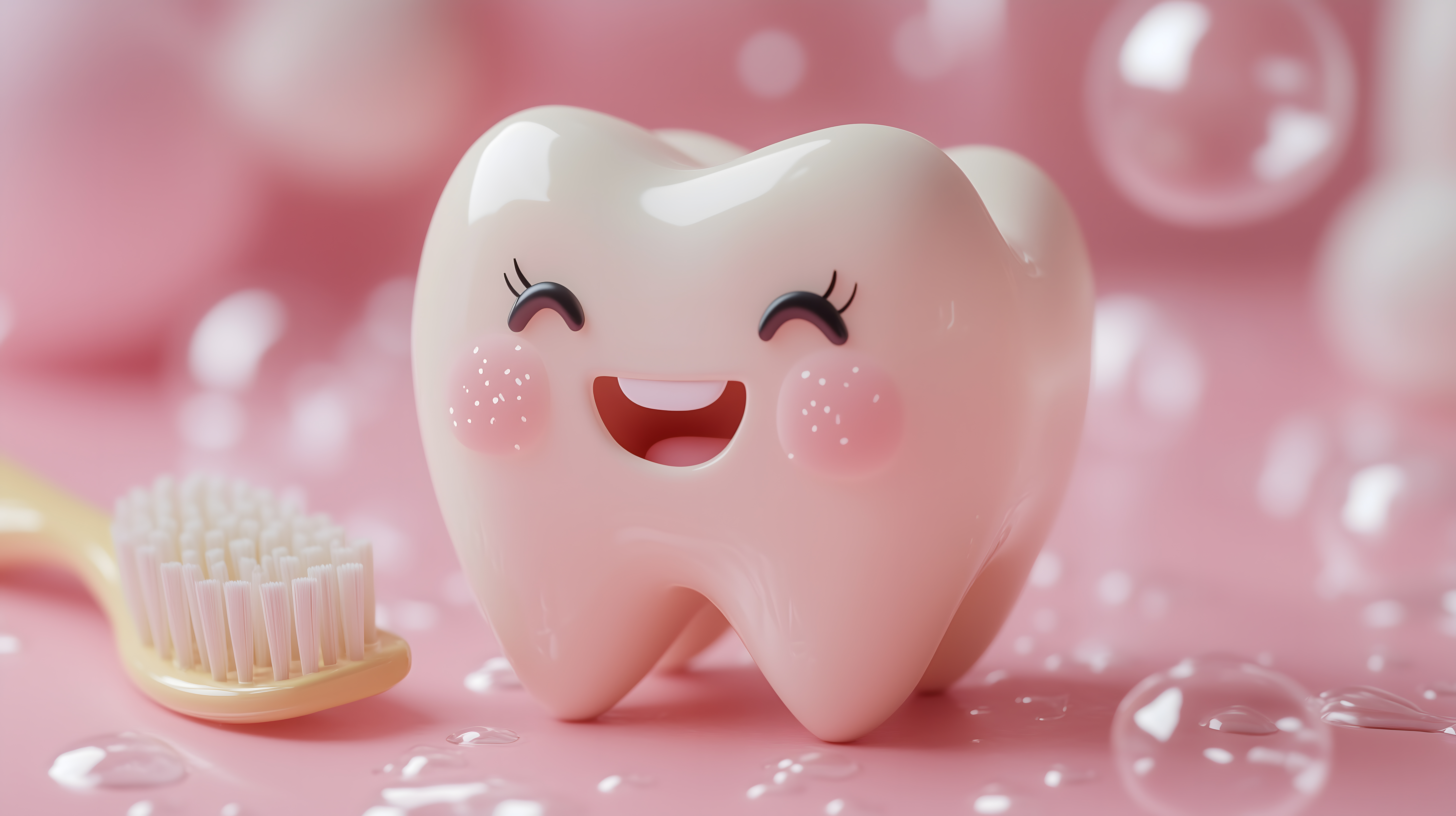 Lachender Zahn mit Zahnbürste in verspieltem Kinderbuch-Stil