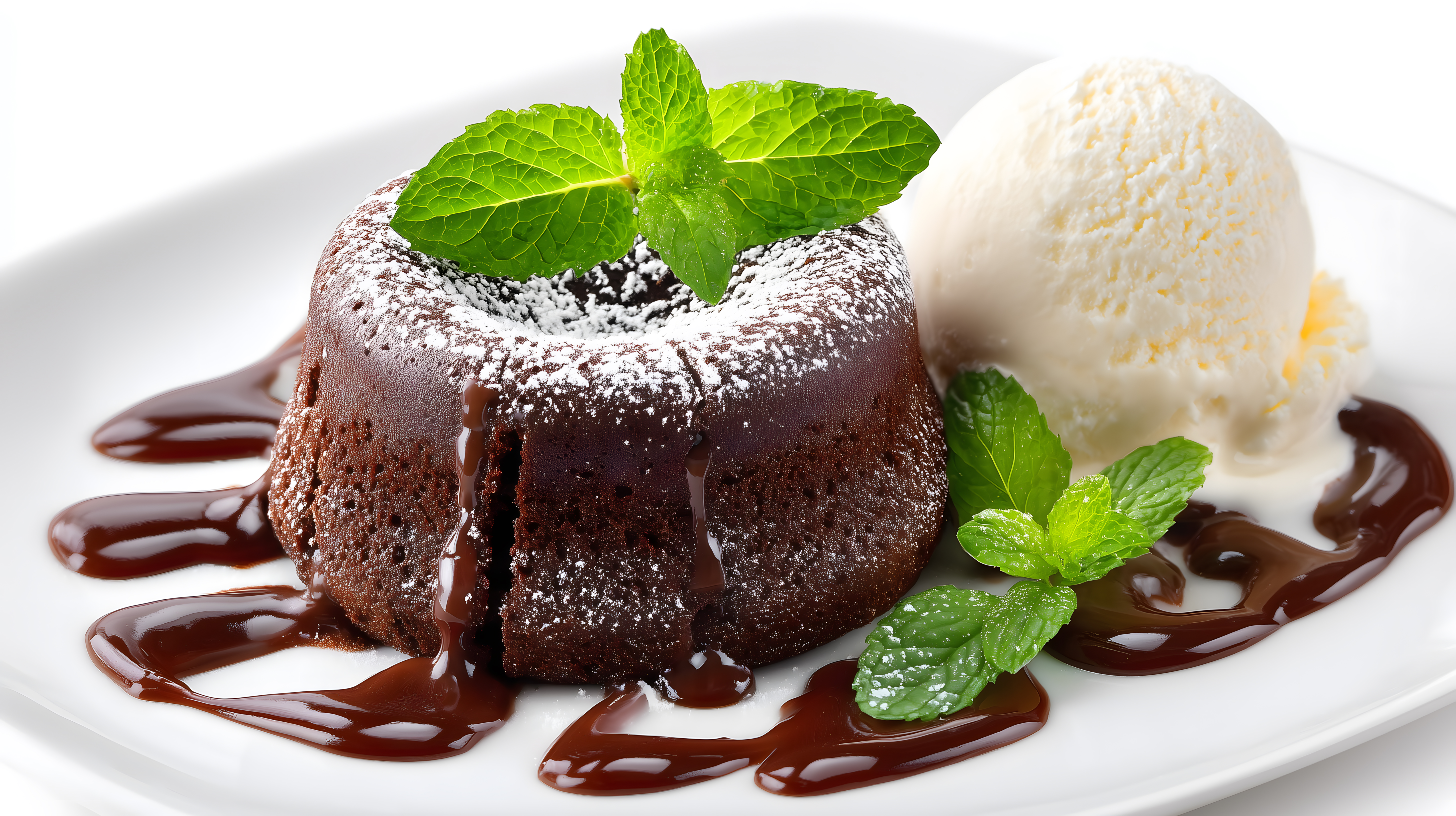 Lava Cake mit Vanilleeis auf Teller mit Minzblatt