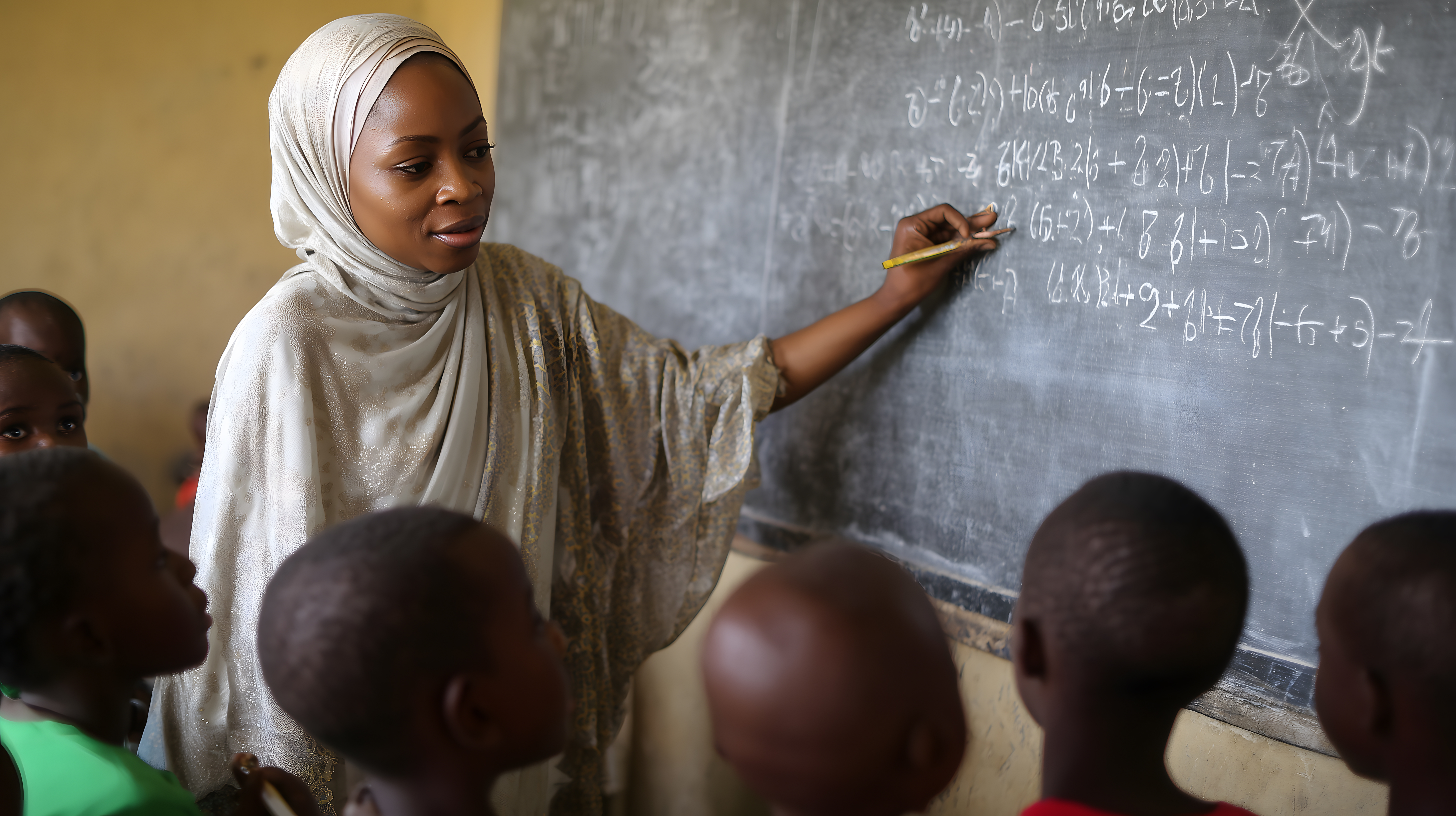 Lehrerin in Afrika erklärt Mathematik an der Tafel im lebendigen Klassenraum