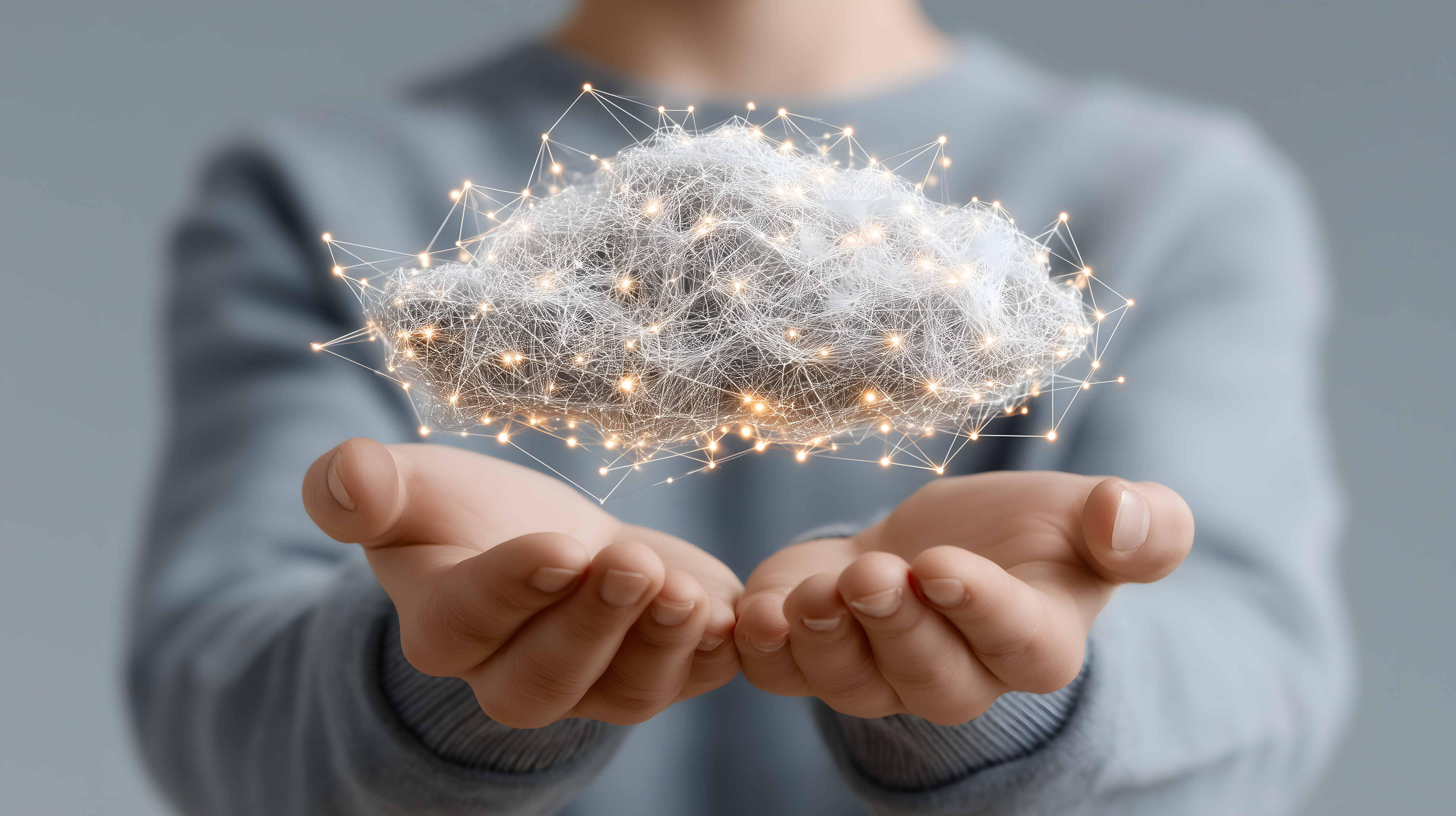 Leuchtende Datenwolke schwebt über offenen Händen in sicherer Umgebung