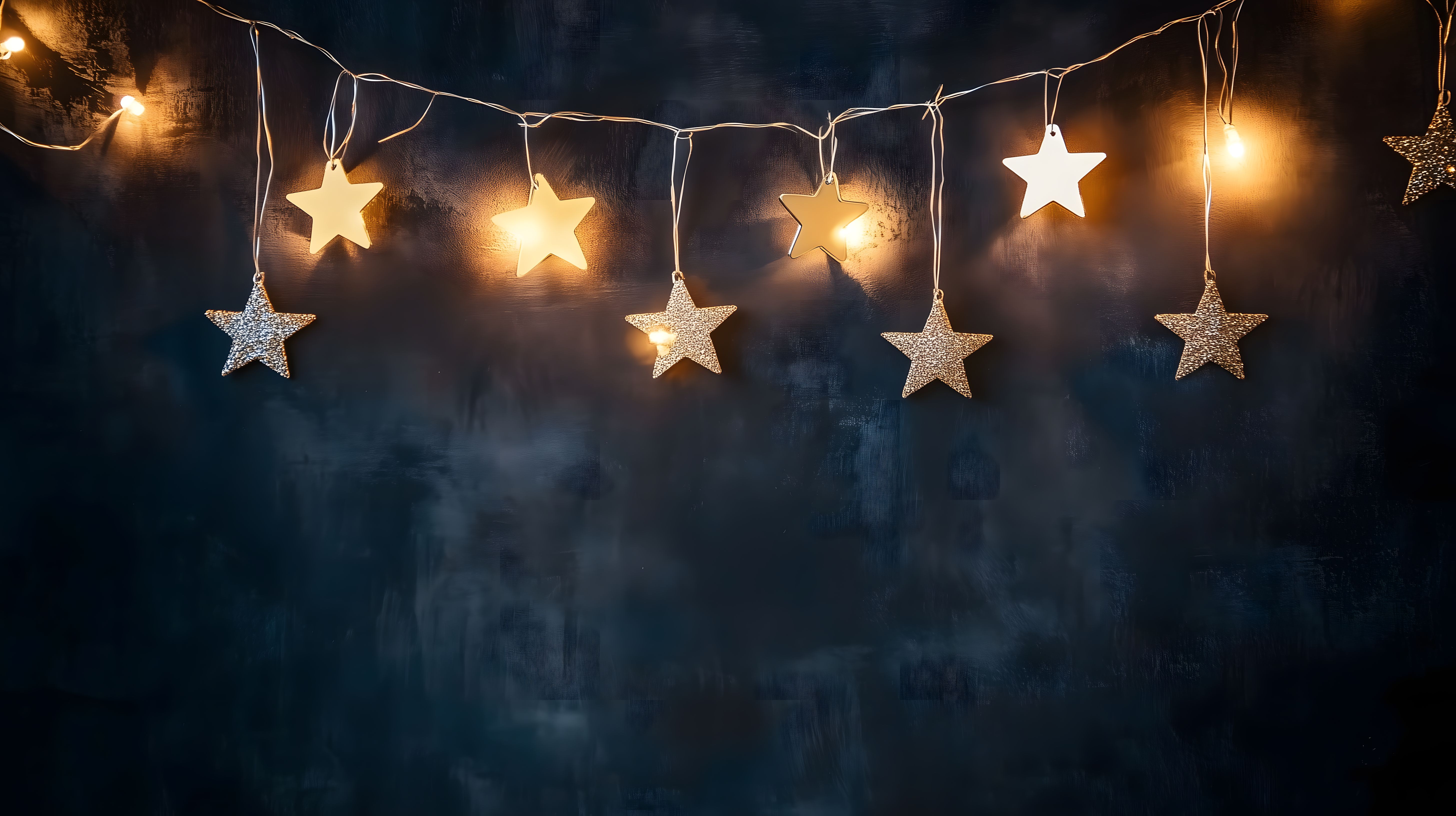 Lichterkette mit Sternen vor dunklem Hintergrund